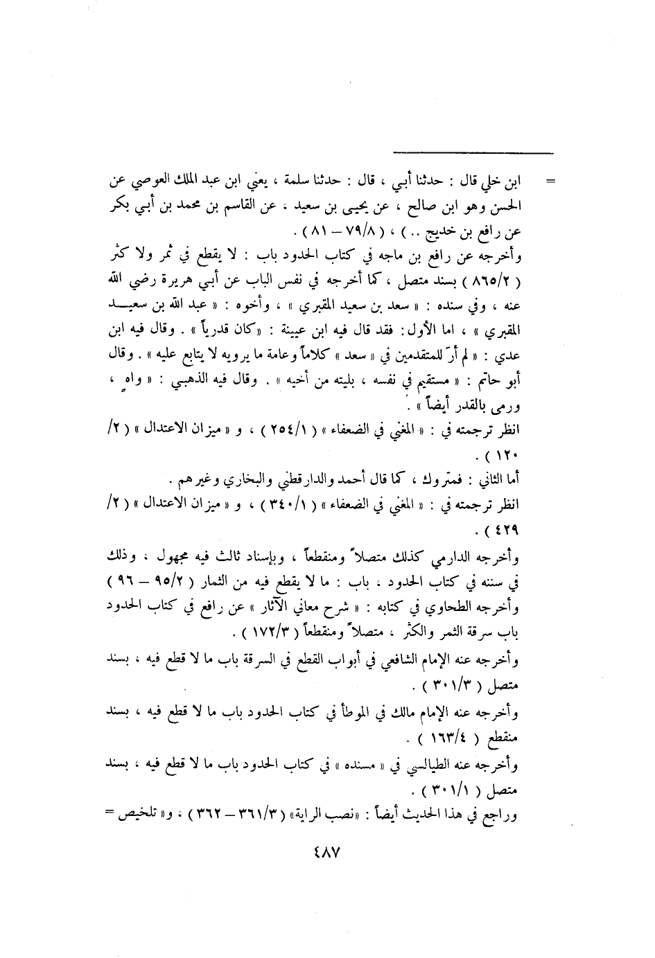 = ابن خلي قال: حدثنا أبي، قال: حدثنا سلمة، يعني ابن عبد الملك العوصي عن الحسن وهو ابن صالح، عن يحيى بن سعيد، عن القاسم بن محمد بن أبي بكر عن رافع بن خديج.."، "٨/٧٩-٨١".