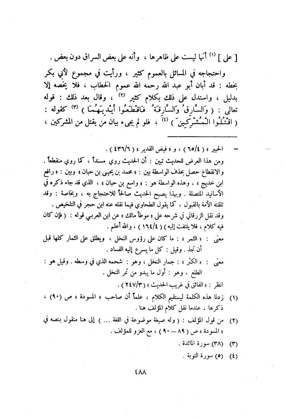 واحتجاجه في المسائل بالعموم كثير، ورأيت في مجموع لأبي بكر بخطه: قد أبان أبو عبد الله رحمه الله عموم الخطاب؛ فلا يخصه إلا بدليل، واستدل على ذلك بكلام كثير٢، وقال بعد ذلك: قوله تعالى: {وَالسَّارِقُ وَالسَّارِقَةُ فَاقْطَعُوا أَيْدِيَهُمَا} ٣ كقوله: {اقْتُلُوا الْمُشْرِكِينَ} ٤؛ فلو لم يجئ بيان من يقتل من المشركين،