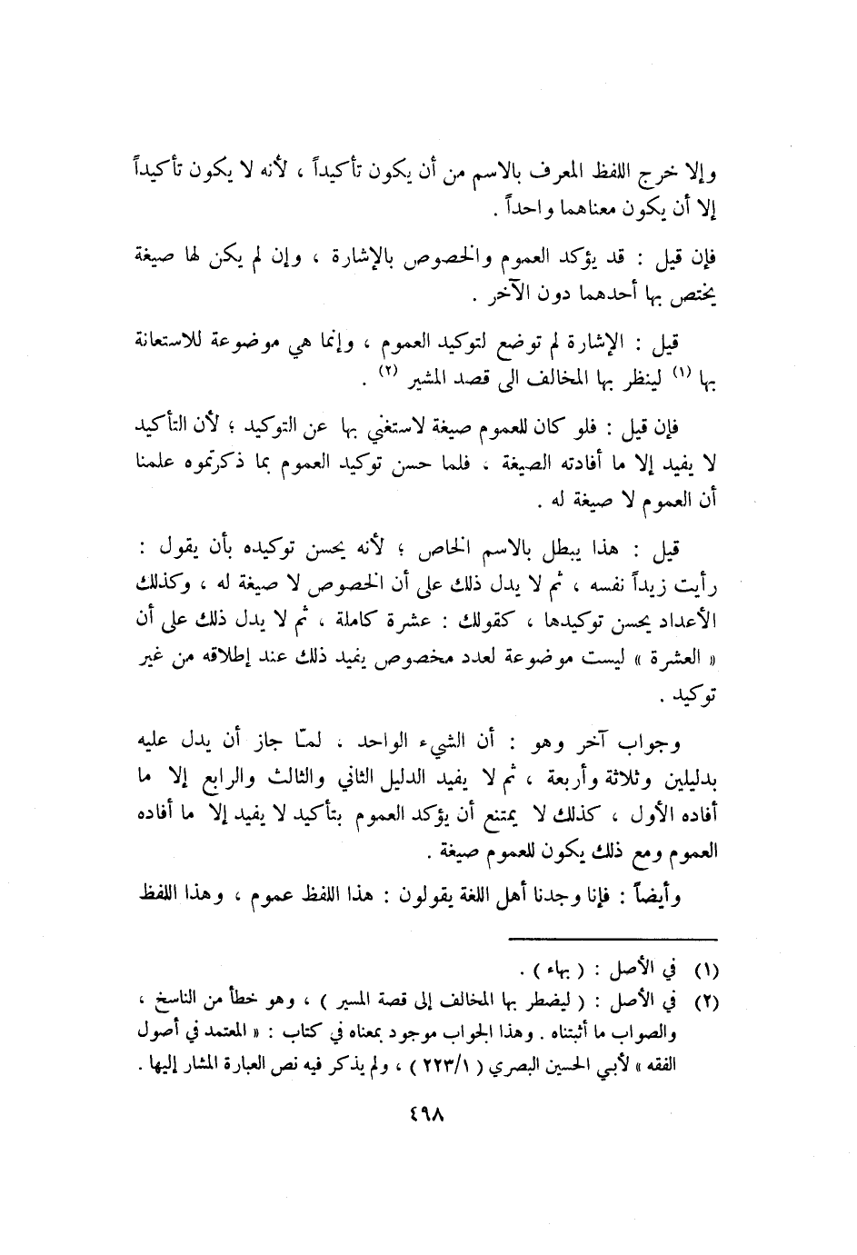 قيل: هذا يبطل بالاسم الخاص؛ لأنه يحسن توكيده بأن يقول: رأيت زيدًا نفسه، ثم لا يدل ذلك على أن الخصوص لا صيغة له، وكذلك الأعداد يحسن توكيدها؛ كقولك: عشرة كاملة، ثم لا يدل ذلك على أن "العشرة" ليست موضوعة لعدد مخصوص يفيد ذلك عند إطلاقه من غير توكيد.