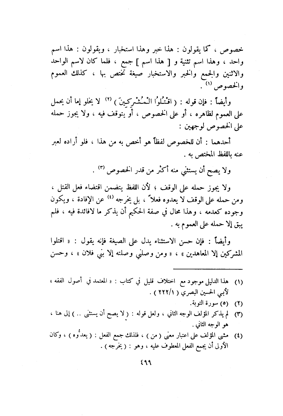 وأيضًا: فإن قوله: {اقْتُلُوا الْمُشْرِكِينَ} ٢ لا يخلو إما أن يحمل على العموم لظاهره، أو على الخصوص، أو يتوقف فيه، ولا يجوز حمله على الخصوص لوجهين: