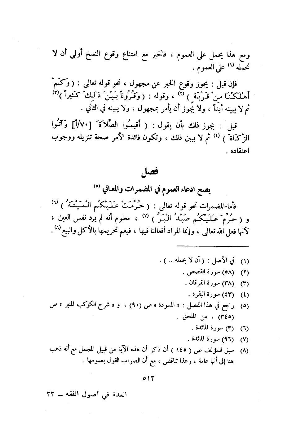 ٤ سبق للمؤلف ص"١٤٥" أن ذكر أن هذه الآية من قبيل المجمل مع أنه ذهب هنا إلى أنها عامة، وهذا تناقض، مع أن الصواب القول بعمومها.