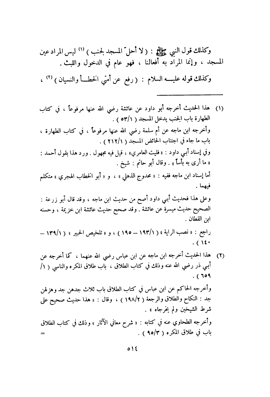 ٢ هذا الحديث أخرجه ابن ماجه عن ابن عباس رضي الله عنهما، كما أخرجه عن أبي ذر رضي الله عنه وذلك في كتاب الطلاق، باب طلاق المكره والناسي "١/٦٥٩".