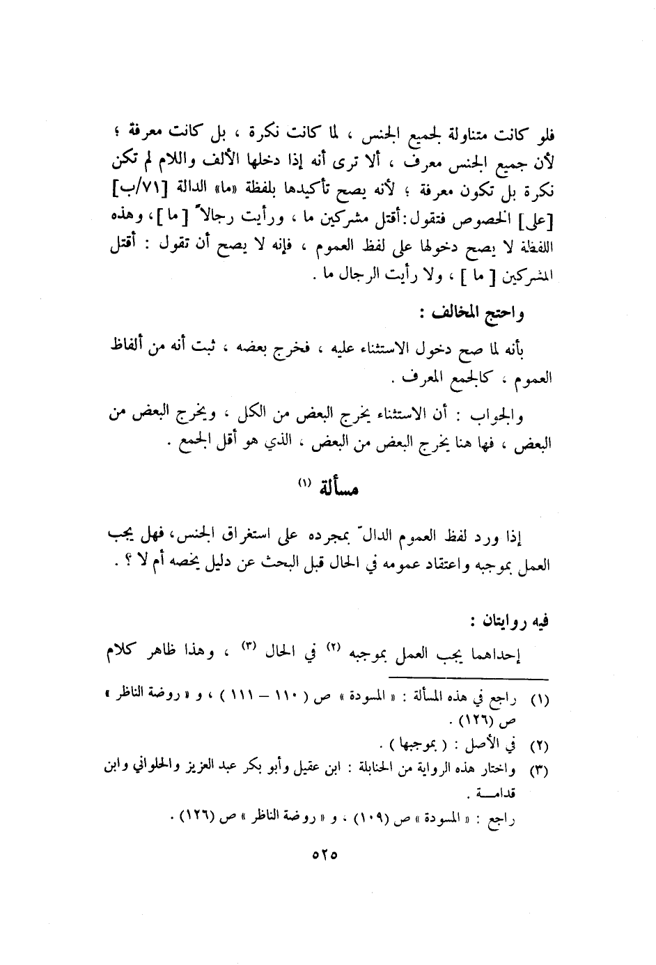 ١ راجع في هذه المسألة: "المسودة" ص"١١٠-١١١"، و"روضة الناظر" ص"١٢٦".