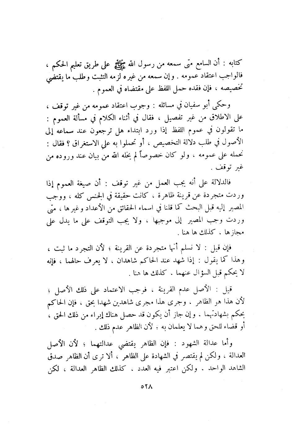 كتابه: أن السامع متى سمعه من رسول الله صلى الله عليه وسلم على طريق تعليم الحكم؛ فالواجب اعتقاد عمومه. وإن سمعه من غيره؛ لزمه التثبت وطلب ما يقتضي تخصيصه، فإن فقده حمل اللفظ على مقتضاه في العموم.