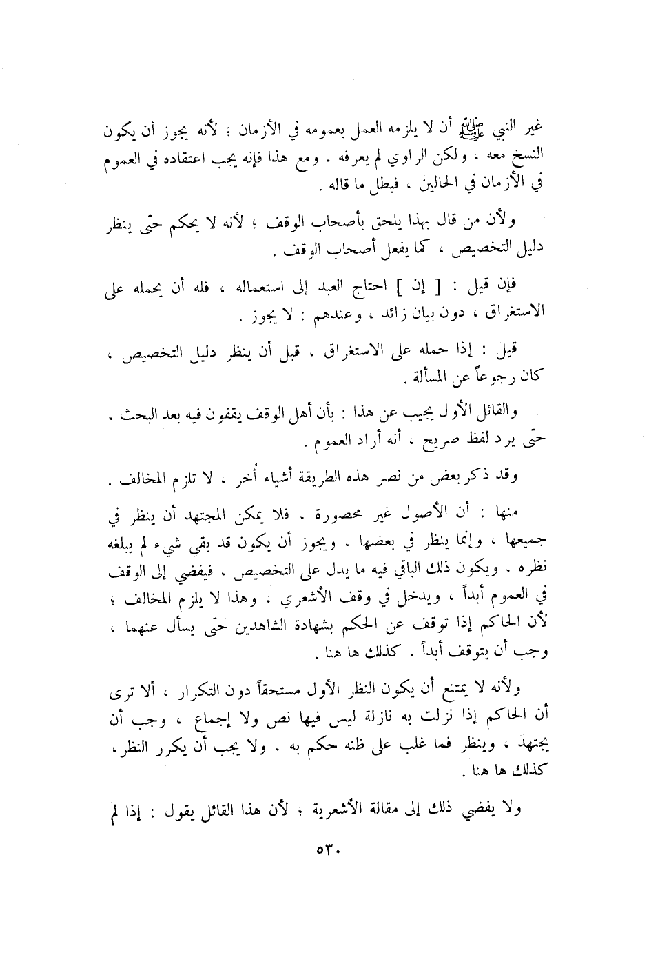 منها: أن الأصول غير محصورة؛ فلا يمكن المجتهد أن ينظر في جميعها؛ وإنما ينظر في بعضها، ويجوز أن يكون قد بقي شيء لم يبلغه نظره، ويكون ذلك الباقي فيه ما يدل على التخصيص، فيفضي إلى الوقف في العموم أبدًا، ويدخل في وقف الأشعري، وهذا لا يلزم المخالف؛ لأن الحاكم إذا توقف عن الحكم بشهادة الشاهدين حتى يسأل عنهما، وجب أن يتوقف أبدًا، كذلك ههنا.
