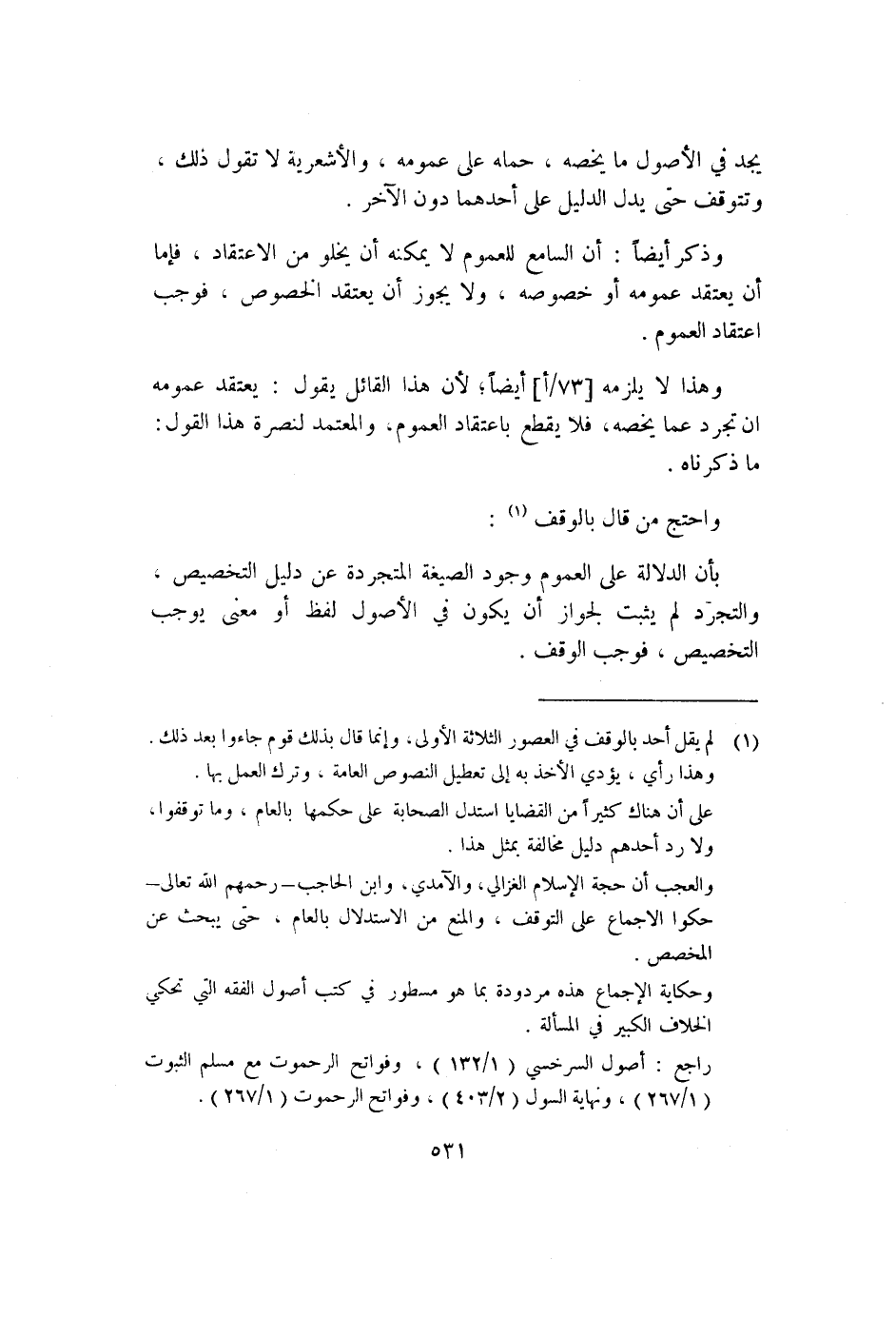 والعجب أن حجة الإسلام الغزالي، والآمدي، وابن الحاجب -رحمه الله تعالى- حكوا الإجماع على التوقف، والمنع من الاستدلال بالعام، حتى يبحث عن المخصص.