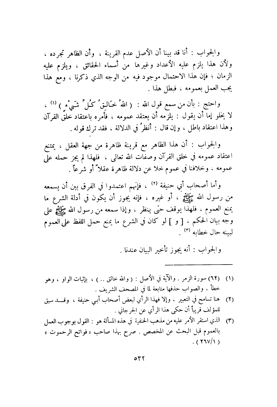 والجواب: أن هذا الظاهر مع قرينة ظاهرة من جهة العقل؛ يمتنع اعتقاد عمومه في خلق القرآن وصفات الله تعالى؛ فلهذا لم يجز حمله على عمومه، وخلافنا في عموم خلا عن دلالة ظاهرة عقلًا أو شرعًا.