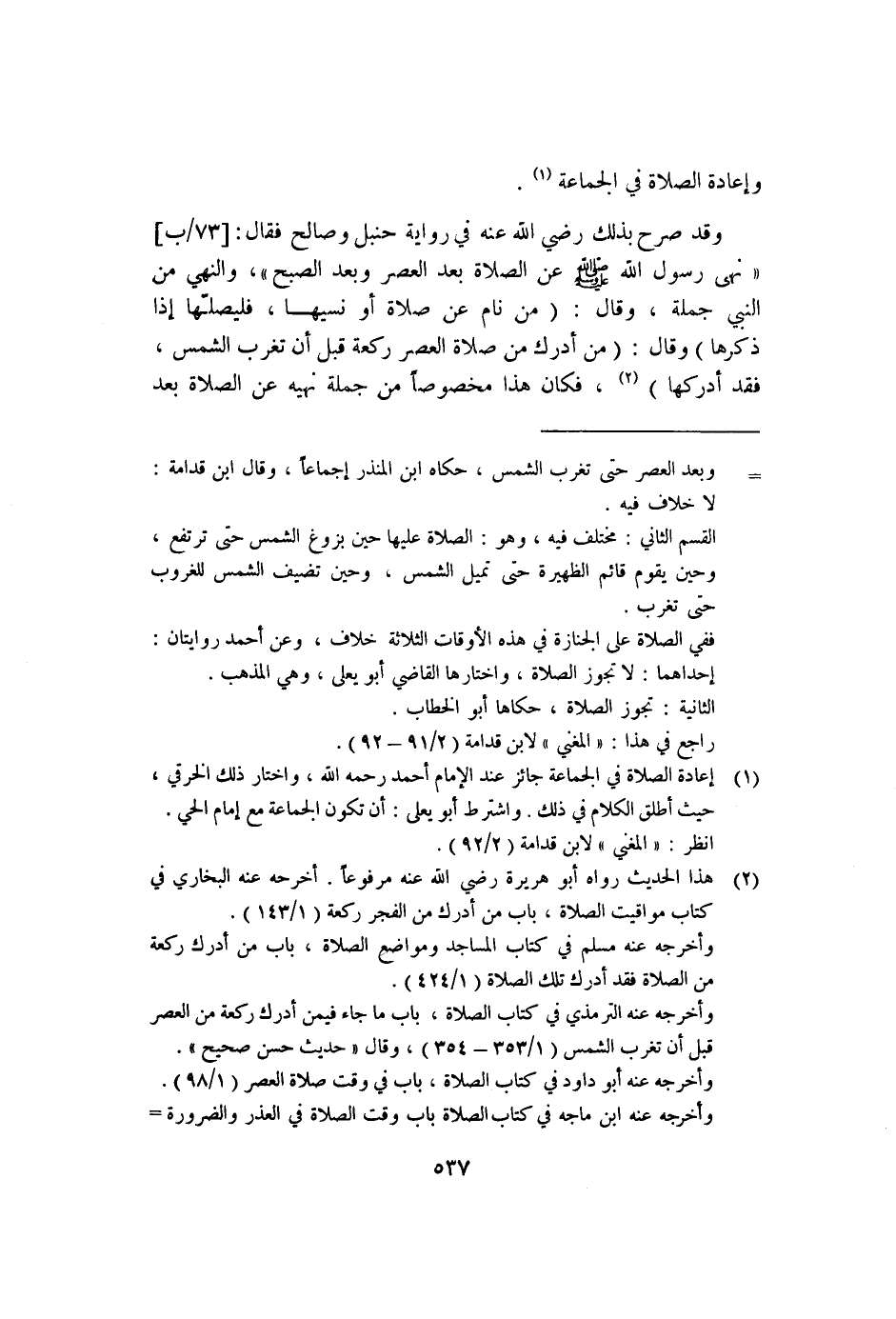 وقد صرح بذلك رضي الله عنه في رواية حنبل وصالح فقال: [٧٣/ب] "نهى رسول الله صلى الله عليه وسلم عن الصلاة بعد العصر وبعد الصبح"، والنهي من النبي جملة، وقال: "من نام عن صلاة أو نسيها؛ فليصلها إذا ذكرها" وقال: "من أدرك من صلاة العصر ركعة قبل أن تغرب الشمس؛ فقد أدركها" ٢؛ فكان هذا مخصوصًا من جملة نهيه عن الصلاة بعد
