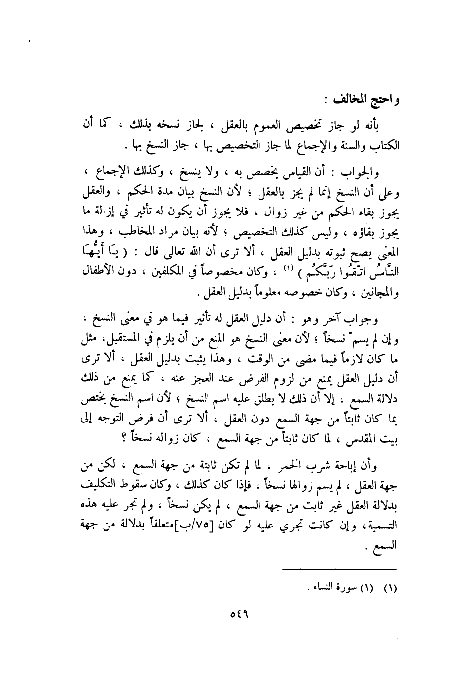 والجواب: أن القياس يخصص به، ولا ينسخ، وكذلك الإجماع، وعلى أن النسخ إنما لم يجز بالعقل؛ لأن النسخ بيان مدة الحكم، والعقل يجوز بقاء الحكم من غير زوال؛ فلا يجوز أن يكون له تأثير في إزالة ما يجوز بقاؤه، وليس كذلك التخصيص؛ لأنه بيان مراد المخاطب، وهذا المعنى يصح ثبوته بدليل العقل، ألا ترى أن الله تعالى قال: {يَا أَيُّهَا النَّاسُ اتَّقُوا رَبَّكُمُ} ١، وكان مخصوصًا في المكلفين، دون الأطفال والمجانين، وكان خصوصه معلومًا بدليل العقل.