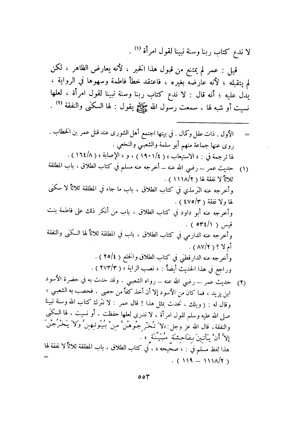 ٢ حديث عمر -رضي الله عنه- رواه الشعبي، وقد حدث به في حضرة الأسود بن يزيد، فما كان من الأسود إلا أن أخذ كفًا من حصى، فحصب به الشعبي، وقال: له: "ويلك، تحدث بمثل هذا! قال عمر: لا نترك كتاب الله وسنة نبينا صلى الله عليه وسلم لقول امرأة، لا ندري لعلها حفظت، أو نسيت، لها السكنى والنفقة، قال الله عز وجل: {لا تُخْرِجُوهُنَّ مِنْ بُيُوتِهِنَّ وَلا يَخْرُجْنَ إِلاَّ أَنْ يَأْتِينَ بِفَاحِشَةٍ مُبَيِّنَةٍ} ".
