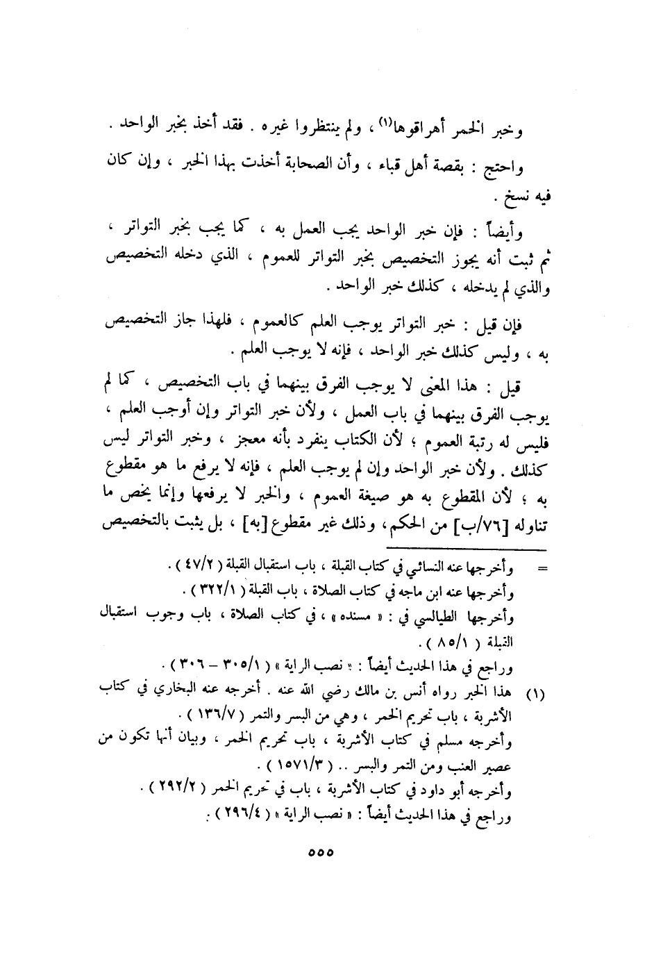 وخبر الخمر أهراقوها١، ولم ينتظروا غيره؛ فقد أخذ بخبر الواحد.