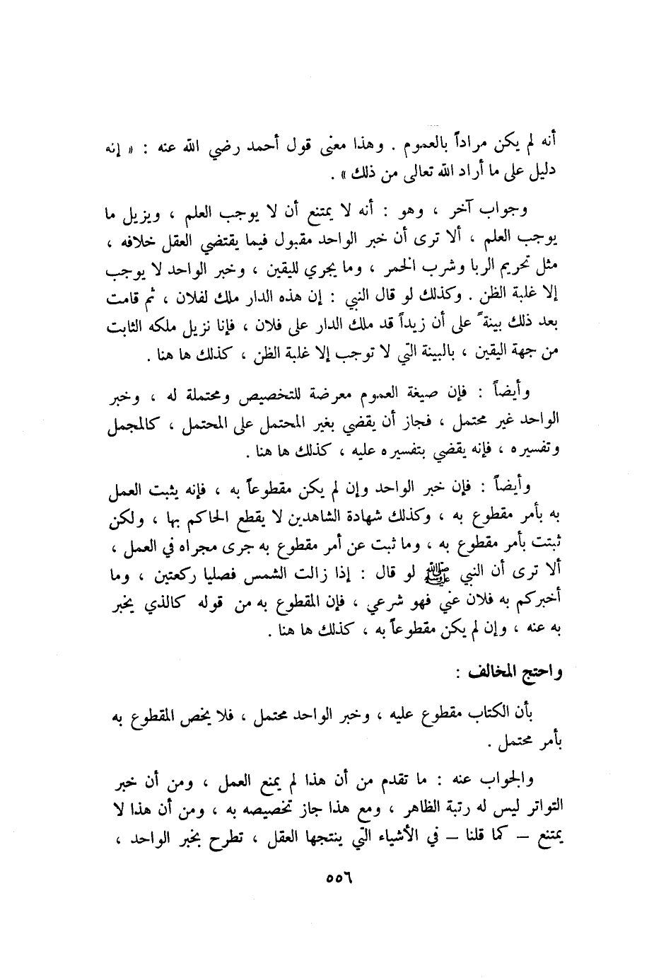 والجواب عنه: ما تقدم من أن هذا لم يمنع العمل، ومن أن خبر التواتر ليس له رتبة الظاهر، ومع هذا جاز تخصيصه به، ومن أن هذا لا يمتنع -كما قلنا- في الأشياء التي ينتجها العقل، تطرح بخبر الواحد،