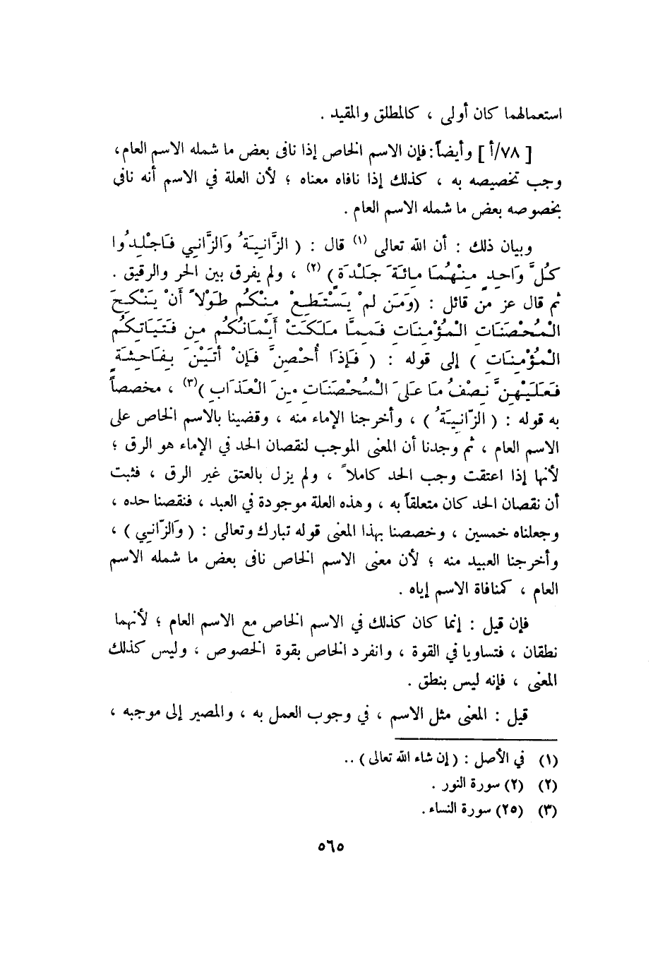 وبيان ذلك أن الله تعالى١ قال: {الزَّانِيَةُ وَالزَّانِي فَاجْلِدُوا كُلَّ وَاحِدٍ مِنْهُمَا مِائَةَ جَلْدَةٍ} ٢، ولم يفرق بين الحر والرقيق، ثم قال عز من قائل: {وَمَنْ لَمْ يَسْتَطِعْ مِنْكُمْ طَوْلًا أَنْ يَنكِحَ الْمُحْصَنَاتِ الْمُؤْمِنَاتِ فَمِنْ مَا مَلَكَتْ أَيْمَانُكُمْ مِنْ فَتَيَاتِكُمُ الْمُؤْمِنَاتِ} إلى قوله: {فَإِذَا أُحْصِنَّ فَإِنْ أَتَيْنَ بِفَاحِشَةٍ فَعَلَيْهِنَّ نِصْفُ مَا عَلَى الْمُحْصَنَاتِ مِنَ الْعَذَابِ} ٣، مخصصًا به قوله: {الزَّانِيَةُ} ، وأخرجنا الإماء منه، وقضينا بالاسم الخاص على الاسم العام، ثم وجدنا أن المعنى الموجب لنقصان الحد في الإماء هو الرق؛ لأنها إذا اعتقت وجب الحد كاملًا، ولم يزل بالعتق غير الرق؛ فثبت أن نقصان الحد كان متعلقًا به، وهذه العلة موجودة في العبد، فنقصنا حده، وجعلناه خمسين، وخصصنا بهذا المعنى قوله تبارك وتعالى: {وَالزَّانِي} ، وأخرجنا العبيد منه؛ لأن معنى الاسم الخاص نافى بعض ما شمله الاسم العام، كمنافاة الاسم إياه.