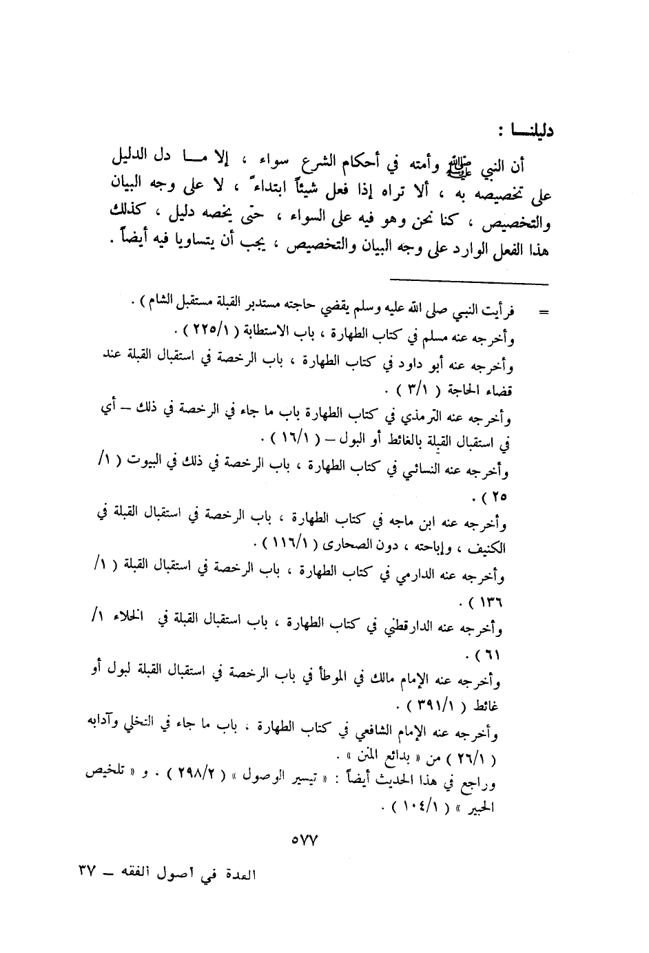 أن النبي صلى الله عليه وسلم وأمته في أحكام الشرع سواء؛ إلا ما دل الدليل على تخصيصه به، ألا تراه إذا فعل شيئًا ابتداء، لا على وجه البيان والتخصيص؛ كنا نحن وهو فيه على السواء، حتى يخصه دليل، كذلك هذا الفعل الوارد على وجه البيان والتخصيص، يجب أن يتساويا فيه أيضًا.