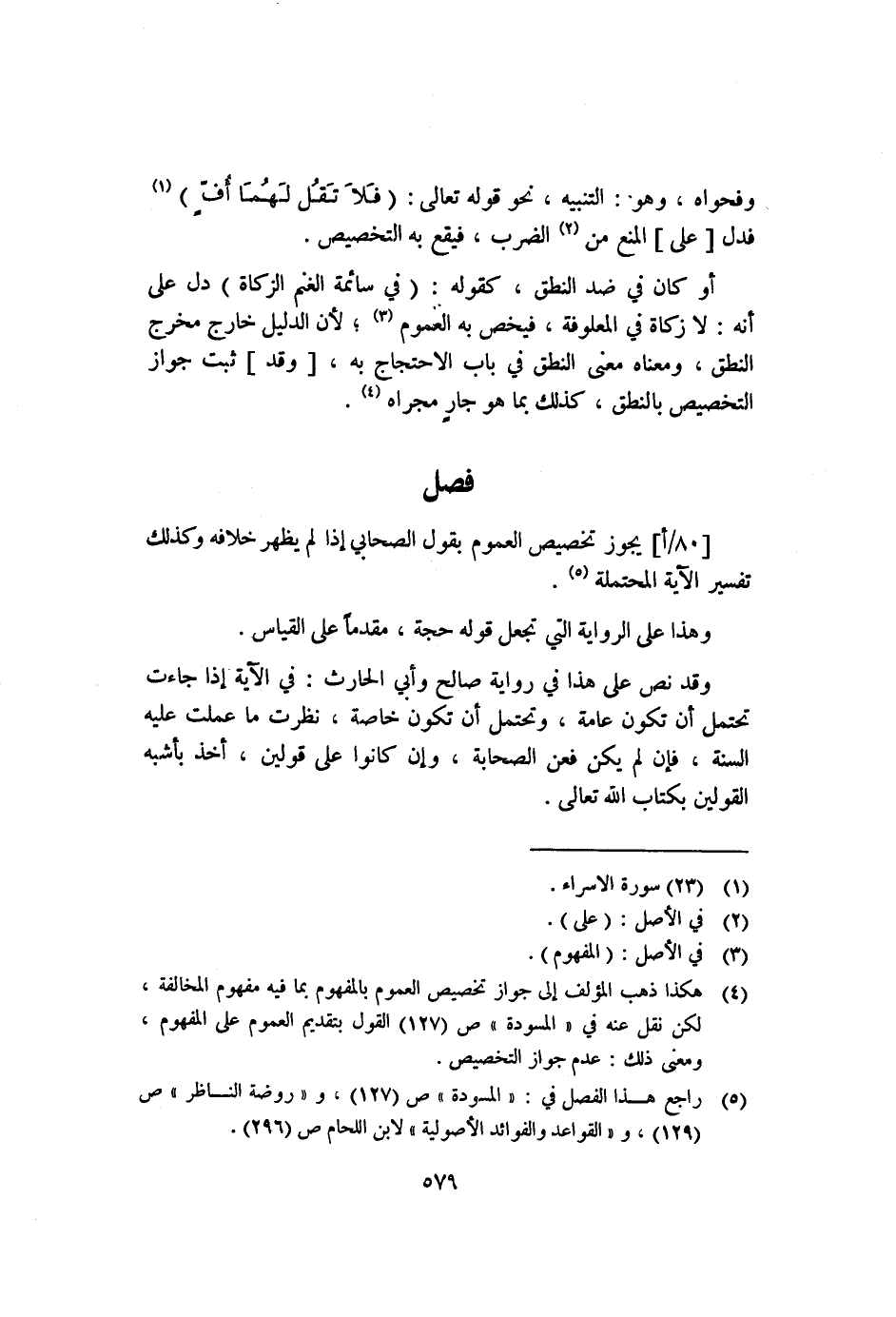 ٤ هكذا ذهب المؤلف إلى جواز تخصيص العموم بالمفهوم بما فيه مفهوم المخالفة؛ لكن نقل عنه في "المسودة" ص"١٢٧" القول بتقديم العموم على المفهوم، ومعنى ذلك: عدم جواز التخصيص.