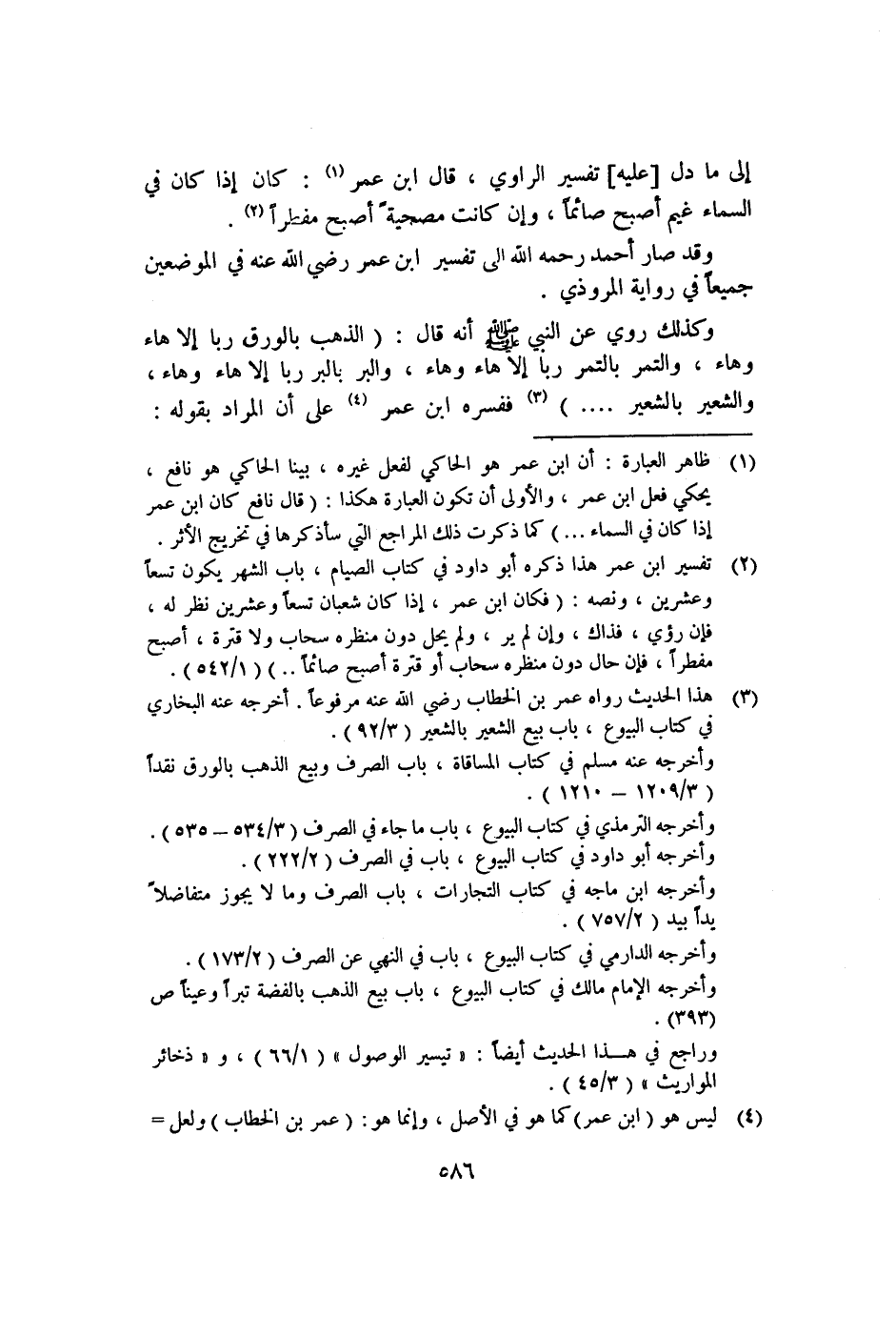 وكذلك روي عن النبي صلى الله عليه وسلم أنه قال: "الذهب بالورق ربًا إلا هاء وهاء، والتمر بالتمر ربًا إلا هاء وهاء، والبر بالبر ربًا إلا هاء وهاء، والشعير بالشعير ... " ٣ ففسره ابن عمر٤ على أن المراد بقوله: