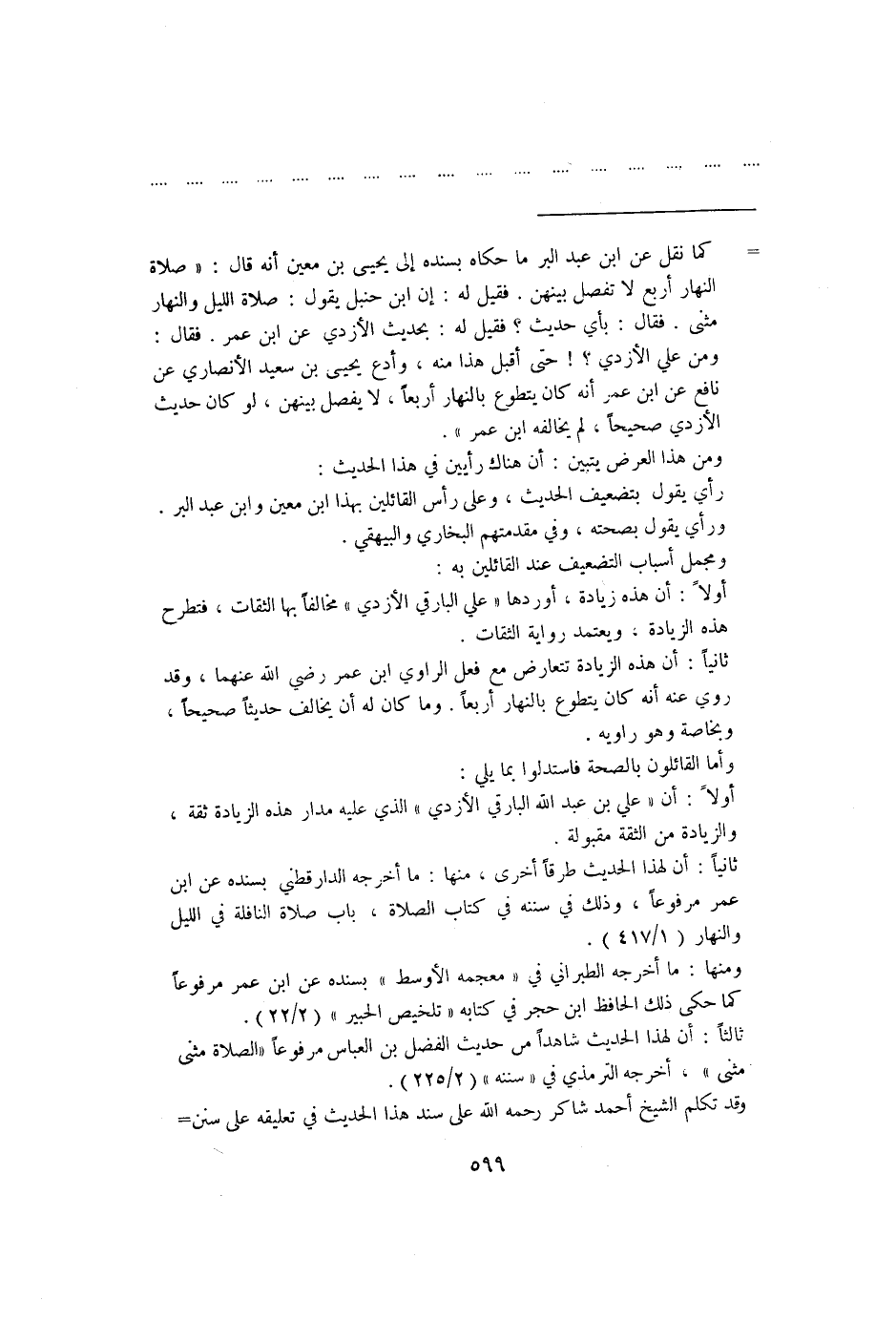 ثانيًا: أن هذه الزيادة تتعارض مع فعل الراوي ابن عمر رضي الله عنهما، وقد روي عنه أنه كان يتطوع بالنهار أربعًا. وما كان له أن يخالف حديثًا صحيحًا، وبخاصة وهو راويه.