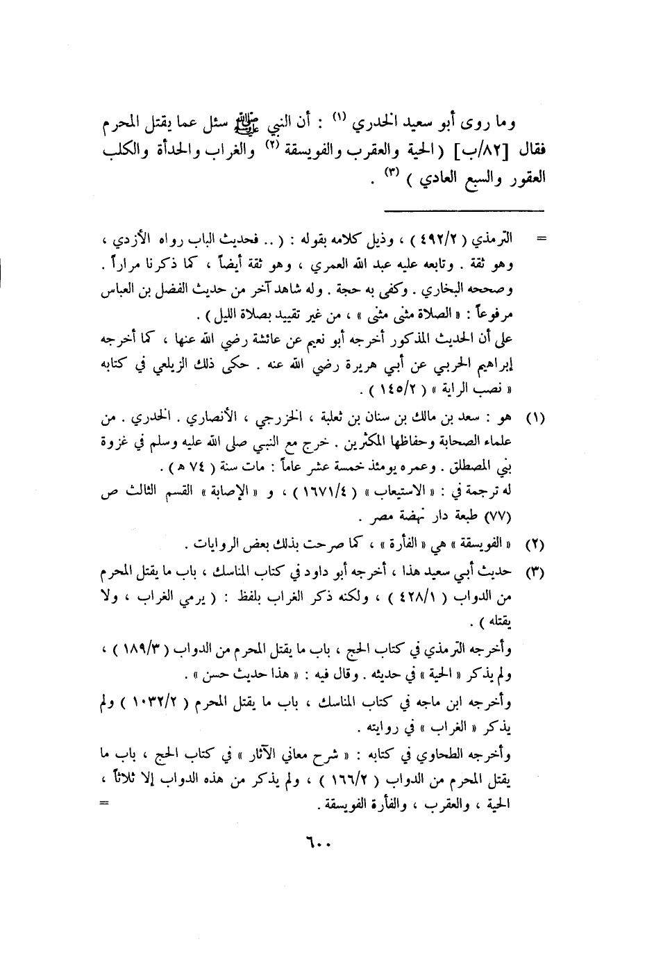 ٣ حديث أبي سعيد هذا؛ أخرجه أبو داود في كتاب المناسك، باب ما يقتل المحرم من الدواب "١/٤٢٨"، ولكنه ذكر الغراب بلفظ: "يرمي الغراب، ولا يقتله".