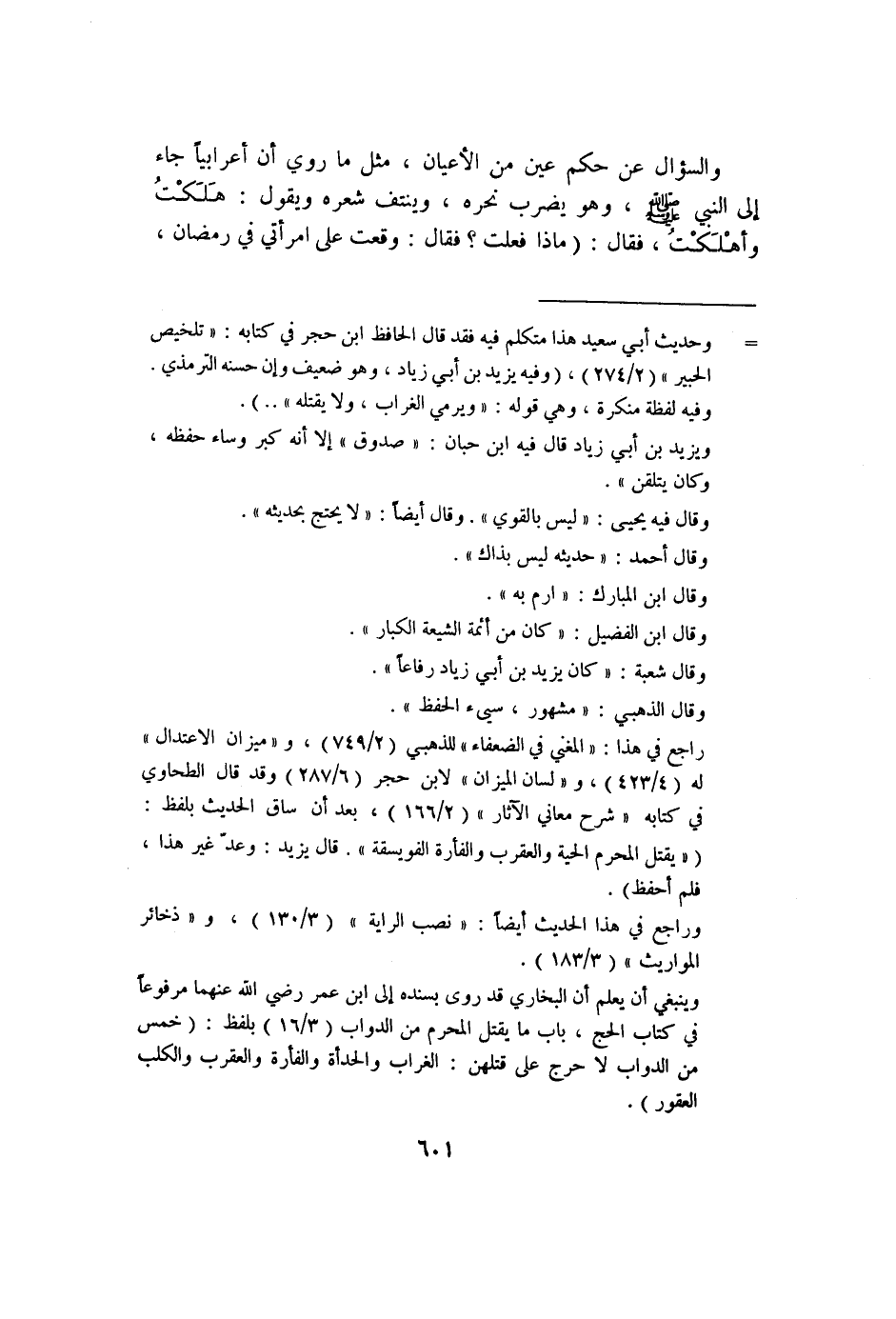 راجع في هذا: "المغني في الضعفاء" للذهبي "٢/٧٤٩"، و"ميزان الاعتدال" له "٤/٤٢٣"، و"لسان الميزان" لابن حجر "٦/٢٨٧" وقد قال الطحاوي في كتابه "شرح معاني الآثار": "٢/١٦٦"، بعد أن ساق الحديث بلفظ: "يقتل المحرم الحية والعقرب والفأرة الفويسقة". قال يزيد: وعد غير هذا؛ فلم أحفظ".