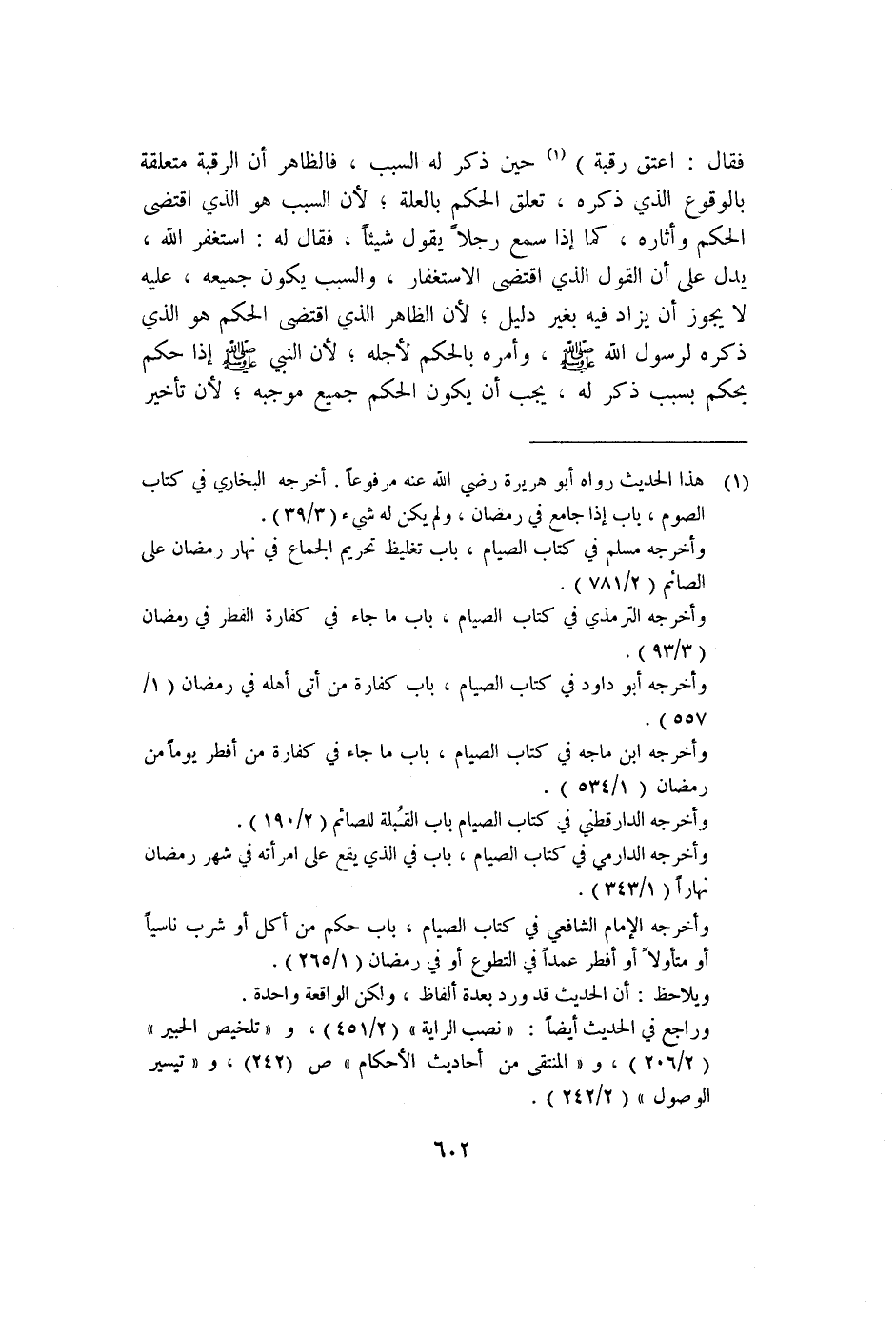 فقال: أعتق رقبة" ١ حين ذكر له السبب؛ فالظاهر أن الرقبة متعلقة بالوقوع الذي ذكره، تعلق الحكم بالعلة؛ لأن السبب هو الذي اقتضى الحكم وآثاره، كما إذا سمع رجلًا يقول شيئًا؛ فقال له: "استغفر الله"، يدل على أن القول الذي اقتضى الاستغفار، والسبب يكون جميعه، عليه لا يجوز أن يزاد فيه بغير دليل؛ لأن الظاهر الذي اقتضى الحكم هو الذي ذكره لرسول الله صلى الله عليه وسلم، وأمره بالحكم لأجله؛ لأن النبي صلى الله عليه وسلم إذا حكم بحكم بسبب ذكر له، يجب أن يكون الحكم جميع موجبه؛ لأن تأخير