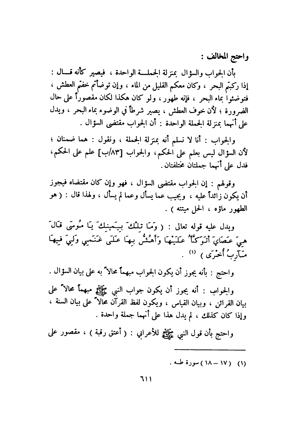والجواب: أنا لا نسلم أنه بمنزلة الجملة، ونقول: هما ضمنان؛ لأن السؤال ليس بعلم على الحكم، والجواب [٨٣/ب] علم على الحكم؛ فدل على أنهما جملتان مختلفتان.