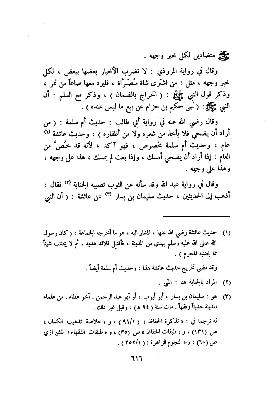 وقال في رواية المروذي: لا تضرب الأخبار بعضها ببعض؛ لكل خبر وجهه، مثل: من اشترى شاة مصراة؛ فليرد معها صاعًا من تمر، وذكر قول النبي صلى الله عليه وسلم: "الخراج بالضمان"، وذكر مع السلم: أن النبي صلى الله عليه وسلم: "نهى حكيم بن حزام عن بيع ما ليس عنده".