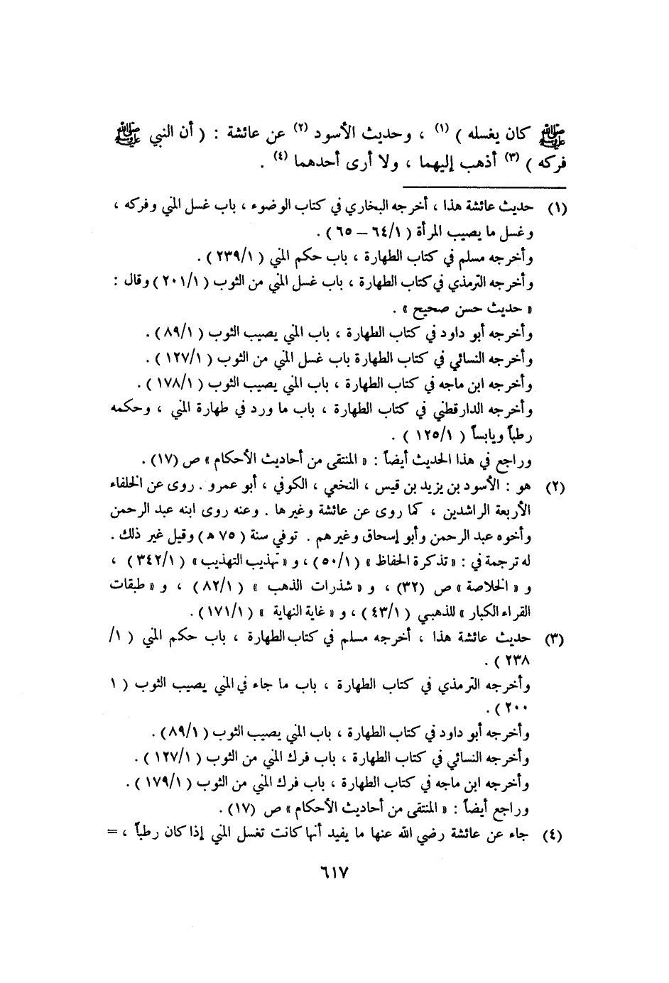 ١ حديث عائشة هذا، أخرجه البخاري في كتاب الوضوء، باب غسل المني وفركه، وغسل ما يصيب المرأة "١/٦٤-٦٥".