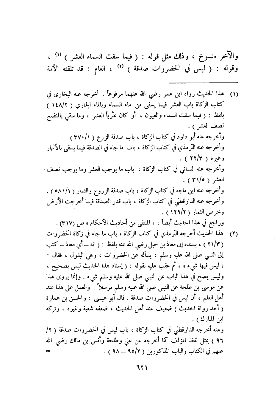 ٢ هذا الحديث أخرجه الترمذي في كتاب الزكاة، باب ما جاء في زكاة الخضروات "٣/٢١"، بسنده إلى معاذ بن جبل رضي الله عنه بلفظ: "إنه -أي معاذ- كتب إلى النبي صلى الله عليه وسلم، يسأله عن الخضروات، وهي البقول؛ فقال: "ليس فيها شيء"، ثم عقب عليه بقوله: "إسناد هذا الحديث ليس بصحيح، وليس يصح في هذا الباب عن النبي صلى الله عليه وسلم شيء؛ وإنما يروى هذا عن موسى بن طلحة عن النبي صلى الله عليه وسلم مرسلًا. والعمل على هذا عند أهل العلم: أن ليس في الخضروات صدقة. قال أبو عيسى: والحسن بن عمارة -أحد رواة الحديث- ضعيف عند أهل الحديث؛ ضعفه شعبة وغيره، وتركه ابن المبارك".