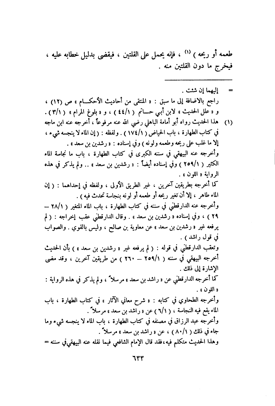 وأخرجه الدارقطني في سننه في كتاب الطهارة، باب الماء المتغير "١/٢٨-٢٩"، وفي إسناده "رشدين بن سعد". وقال الدارقطني عقب إخراجه: "لم يرفعه غير "رشدين بن سعد" عن معاوية بن صالح، وليس بالقوي، والصواب في قول راشد".