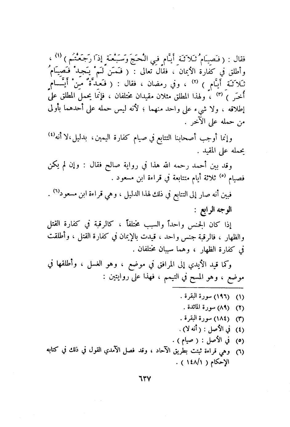 فقال: {فَصِيَامُ ثَلاثَةِ أَيَّامٍ فِي الْحَجِّ وَسَبْعَةٍ إِذَا رَجَعْتُمْ} ١، وأطلق في كفارة الأيمان، فقال تعالى: {فَمَنْ لَمْ يَجِدْ فَصِيَامُ ثَلاثَةِ أَيَّامٍ} ٢، وفي رمضان، فقال: {فَعِدَّةٌ مِنْ أَيَّامٍ أُخَرٍ} ٣؛ ولهذا المطلق مثلان مقيدان مختلفان؛ فإنما يحمل المطلق على إطلاقه، ولا شيء على واحد منهما؛ لأنه ليس حمله على أحدهما بأولى من حمله على الآخر.