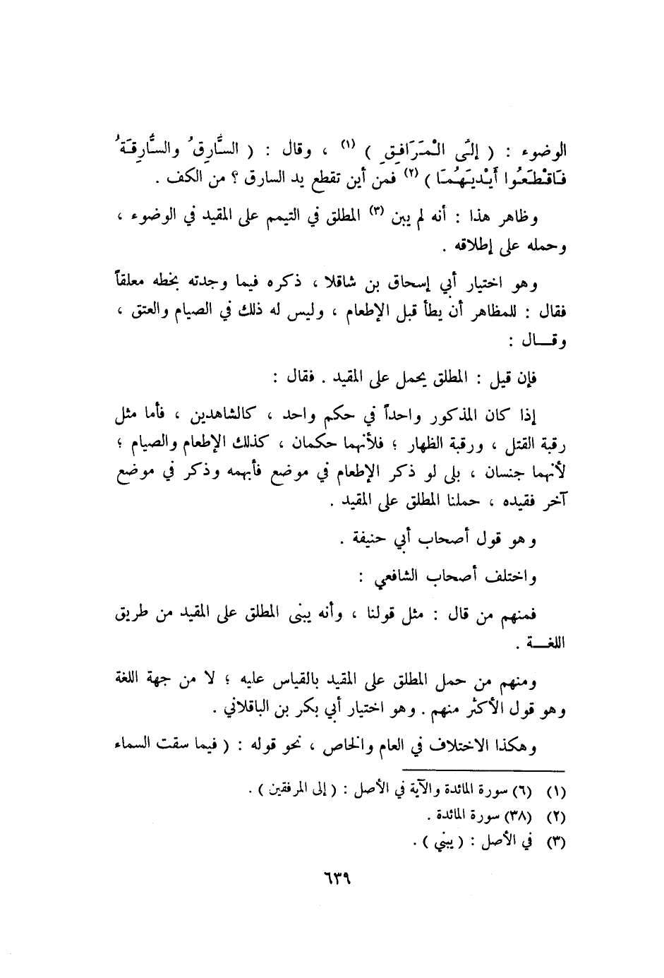 الوضوء: {إِلَى الْمَرَافِقِ} ١، وقال: {السَّارِقُ وَالسَّارِقَةُ فَاقْطَعُوا أَيْدِيَهُمَا} ٢ فمن أين تقطع يد السارق؟ من الكف.