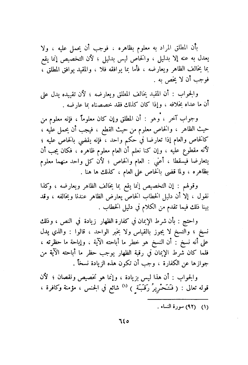 وجواب آخر، وهو: أن المطلق وإن كان معلومًا؛ فإنه معلوم من حيث الظاهر، والخاص معلوم من حيث القطع؛ فيجب أن يحمل عليه، كالخاص والعام إذا تعارضا في حكم واحد؛ فإنه يقضى بالخاص عليه؛ لأنه مقطوع عليه، وإن كنا نعلم أن العام معلوم ظاهره؛ فكان يجب أن يتعارضا فيسقطا، أعني: العام والخاص؛ لأن كل واحد منهما معلوم بظاهره، ولما قضي بالخاص على العام، كذلك ههنا.