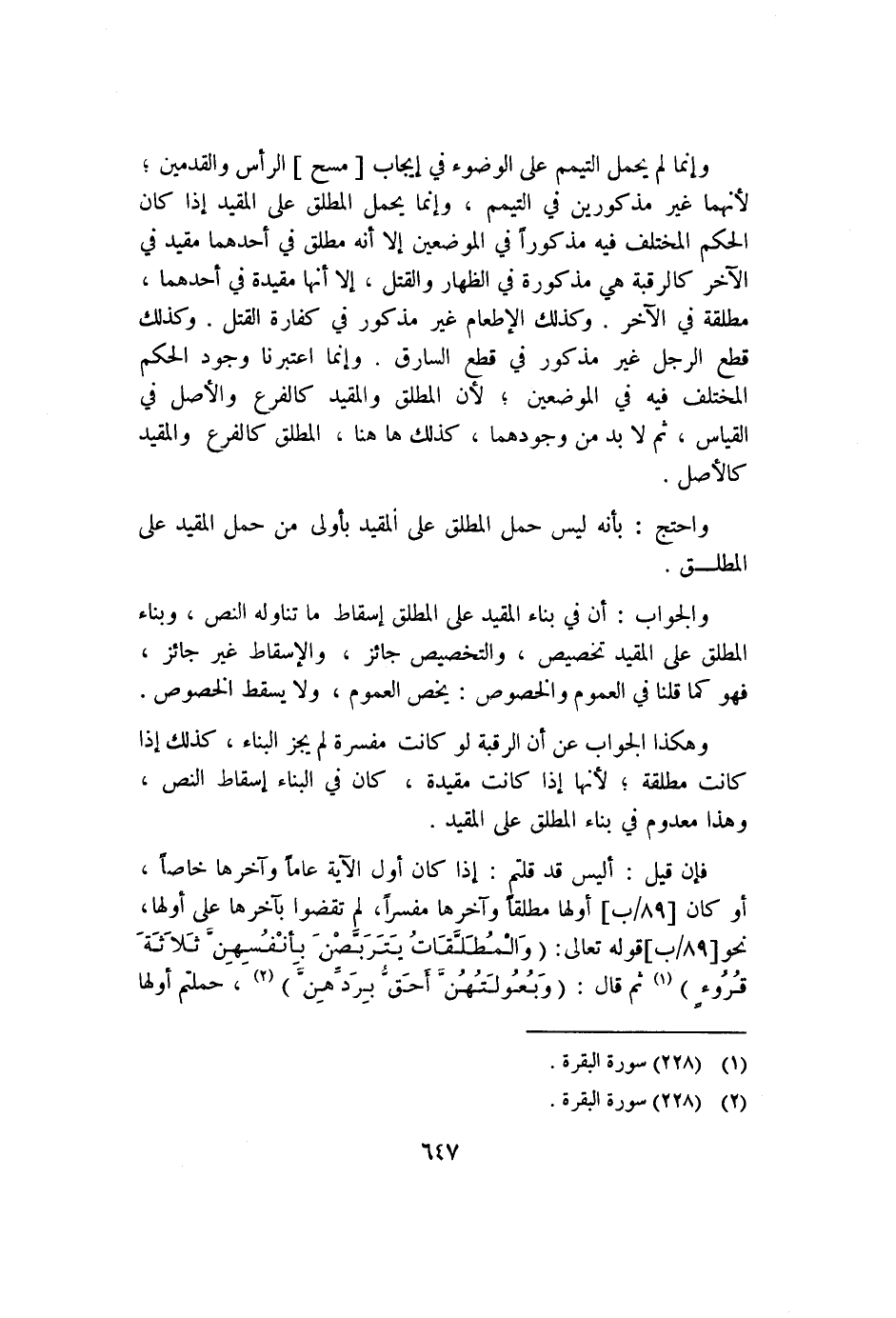 وإنما لم يحمل التيمم على الوضوء في إيجاب [مسح] الرأس والقدمين؛ لأنهما غير مذكروين في التيمم؛ وإنما يحمل المطلق على المقيد إذا كان الحكم المختلف فيه مذكورًا في الموضعين إلا أنه مطلق في أحدهما مقيد في الآخر كالرقبة هي مذكورة في الظهار والقتل؛ إلا أنها مقيدة في أحدهما، مطلقة في الآخر، وكذلك الإطعام غير مذكور في كفارة القتل. وكذلك قطع الرجل غير مذكور في قطع السارق؛ وإنما اعتبرنا وجود الحكم المختلف فيه في الموضعين؛ لأن المطلق والمقيد كالفرع والمقيد كالأصل.