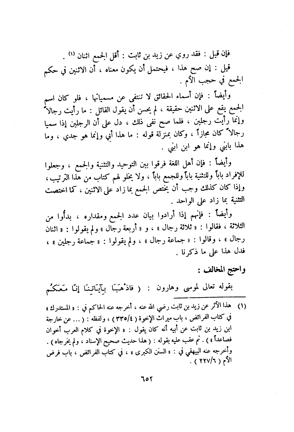 وأيضًا: فإن أهل اللغة فرقوا بين التوحيد والتثنية والجمع، وجعلوا للإفراد بابًا وللتثنية بابًا وللجمع بابًا، ولا يخلو لهم كتاب من هذا الترتيب، وإذا كان كذلك؛ وجب أن يختص الجمع بما زاد على الاثنين، كما اختصت التثنية بما زاد على الواحد.