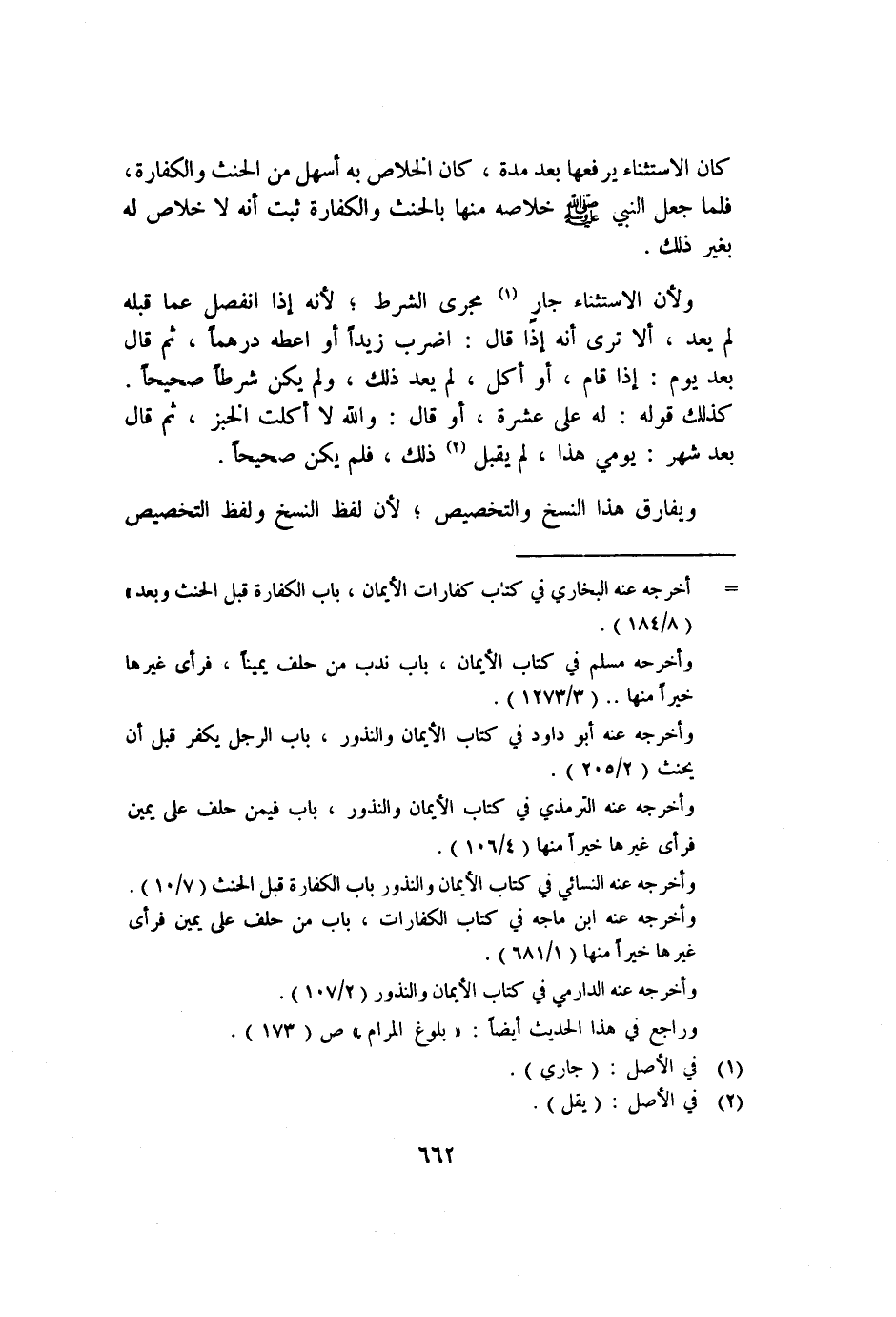 كان الاستثناء يرفعهما بعد مدة، كان الخلاص به أسهل من الحنث والكفارة؛ فلما جعل النبي صلى الله عليه وسلم خلاصه منها بالحنث والكفارة؛ ثبت أنه لا خلاص له بغير ذلك.