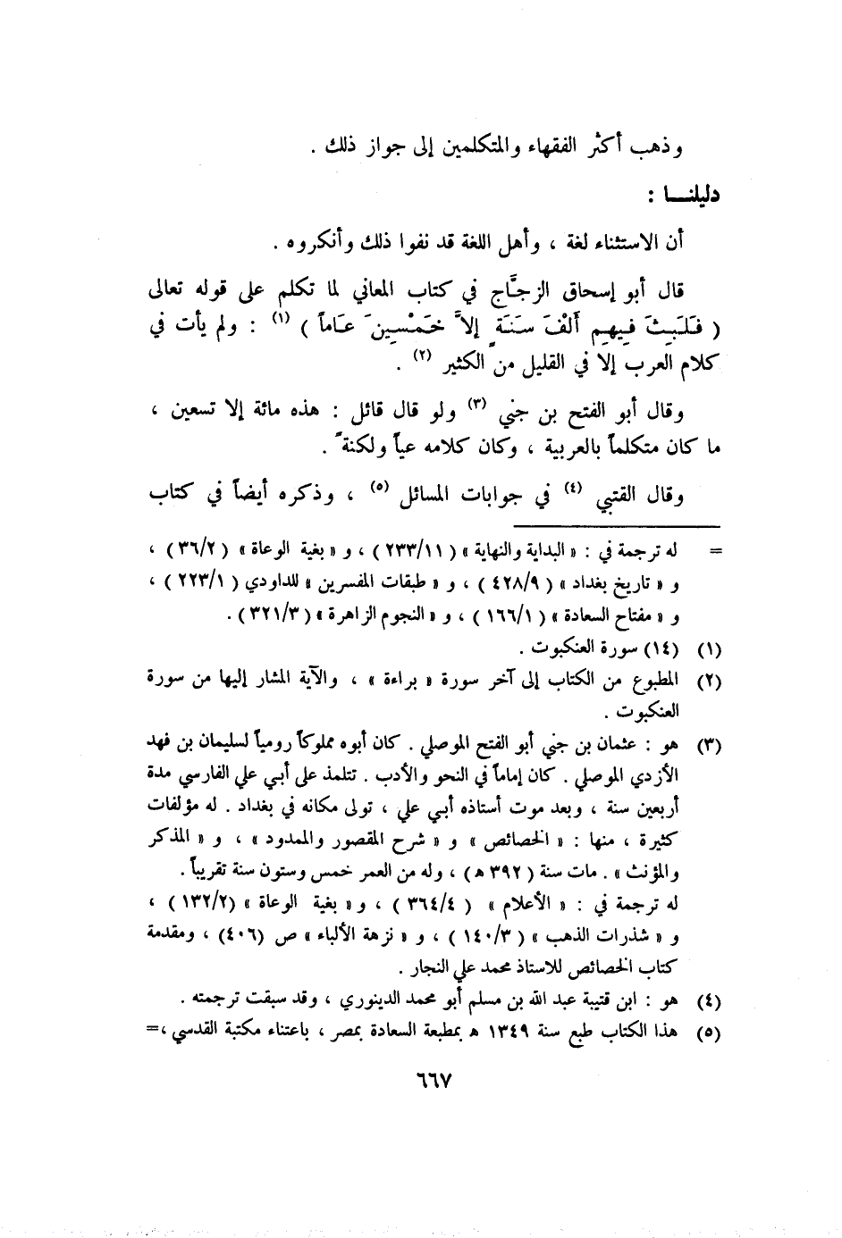 قال أبو إسحاق الزجاج في كتاب المعاني لما تكلم على قوله تعالى: {فَلَبِثَ فِيهِمْ أَلْفَ سَنَةٍ إِلاَّ خَمْسِينَ عَامًا} ١: ولم يأت في كلام العرب إلا في القليل من الكثير٢.