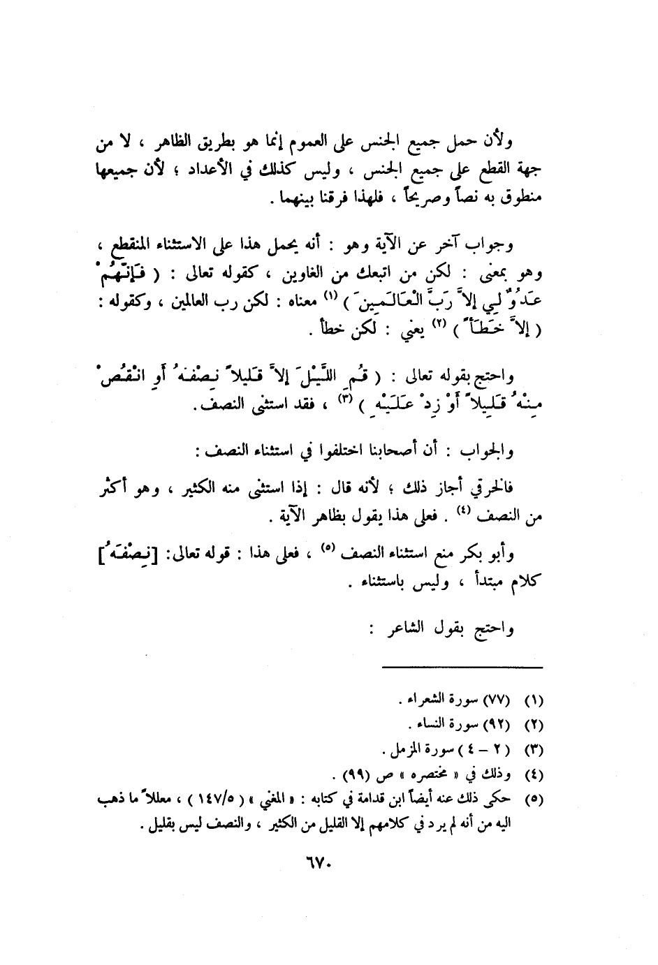 واحتج بقوله تعالى: {قُمِ اللَّيْلَ إِلاَّ قَلِيلًا، نِصْفَهُ أَوْ انْقُصْ مِنْهُ قَلِيلًا، أَوْ زِدْ عَلَيْهِ} ٣؛ فقد استثنى النصف.