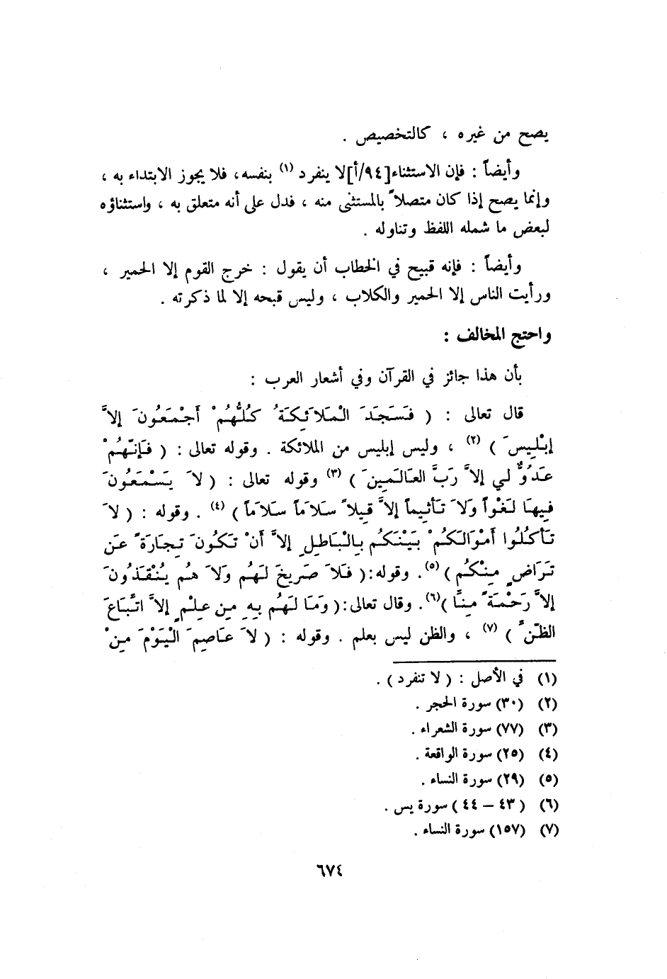 قال تعالى: {فَسَجَدَ الْمَلائِكَةُ كُلُّهُمْ أَجْمَعُونَ، إِلاَّ إِبْلِيسَ} ١، وليس إبليس من الملائكة، وقوله تعالى: {فَإِنَّهُمْ عَدُوٌّ لِي إِلاَّ رَبَّ الْعَالَمِينَ} ٢ وقوله تعالى: {لا يَسْمَعُونَ فِيهَا لَغْوًا وَلا تَأْثِيمًا، إِلاَّ قِيلًا سَلامًا سَلامًا} ٣، وقوله: {لا تَأْكُلُوا أَمْوَالَكُمْ بَيْنَكُمْ بِالْبَاطِلِ إِلاَّ أَنْ تَكُونَ تِجَارَةً عَنْ تَرَاضٍ مِنْكُمْ} ٤. وقال تعالى: {فَلَا صَرِيخَ لَهُمْ وَلَا هُمْ يُنقَذُونَ، إِلَّا رَحْمَةً مِنَّا} ٥. وقال تعالى: {مَا لَهُمْ بِهِ مِنْ عِلْمٍ إِلَّا اتِّبَاعَ الظَّنِّ} ٦، والظن ليس بعلم، وقوله: {لا عَاصِمَ الْيَوْمَ مِنْ