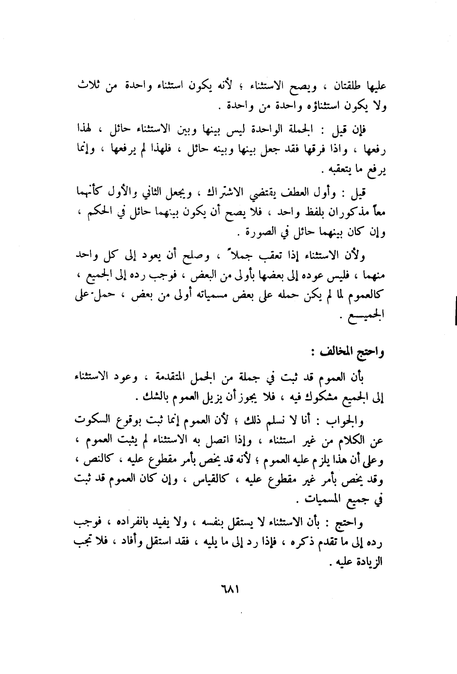 والجواب: أنا لا نسلم ذلك؛ لأن العموم إنما ثبت بوقوع السكوت عن الكلام من غير استثناء، وإذا اتصل به الاستثناء؛ لم يثبت العموم، وعلى هذا يلزم عليه العموم؛ لأنه قد يخص بأمر مقطوع عليه، كالنص، وقد يخص بأمر غير مقطوع عليه، كالقياس، وإن كان العموم قد ثبت في جميع المسميات.