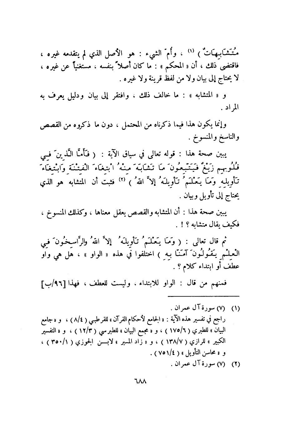 يبين صحة هذا: قوله تعالى في سياق الآية: {فَأَمَّا الَّذِينَ فِي قُلُوبِهِمْ زَيْغٌ فَيَتَّبِعُونَ مَا تَشَابَهَ مِنْهُ ابْتِغَاءَ الْفِتْنَةِ وَابْتِغَاءَ تَأْوِيلِهِ وَمَا يَعْلَمُ تَأْوِيلَهُ إِلاَّ اللَّهُ} ٢ فثبت أن المتشابه هو الذي يحتاج إلى تأويل وبيان.