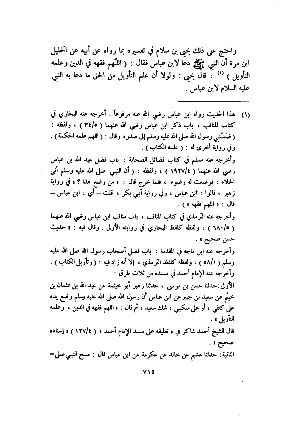 واحتج على ذلك يحيى بن سلام في تفسيره بما رواه عن أبيه عن الخليل ابن مرة أن النبي - صلى الله عليه وسلم - دعا لابن عباس فقال: (اللهم فقهه في الدين وعلمه التأويل) (١) ، قال يحيى: ولولا أن علم التأويل من الحق ما دعا به النبي عليه السلام لابن عباس.