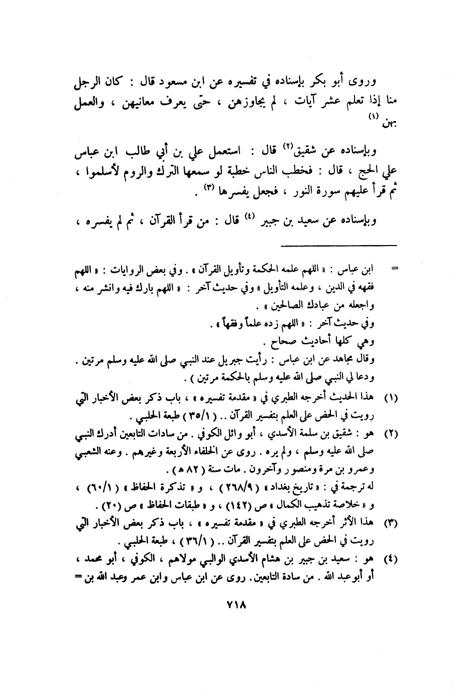 (٣) هذا الأثر أخرجه الطبري في "مقدمة تفسيره"، باب ذكر بعض الأخبار التي رويت في الحض على العلم بتفسير القرآن.. (١/٣٦) ، طبعة الحلبي.