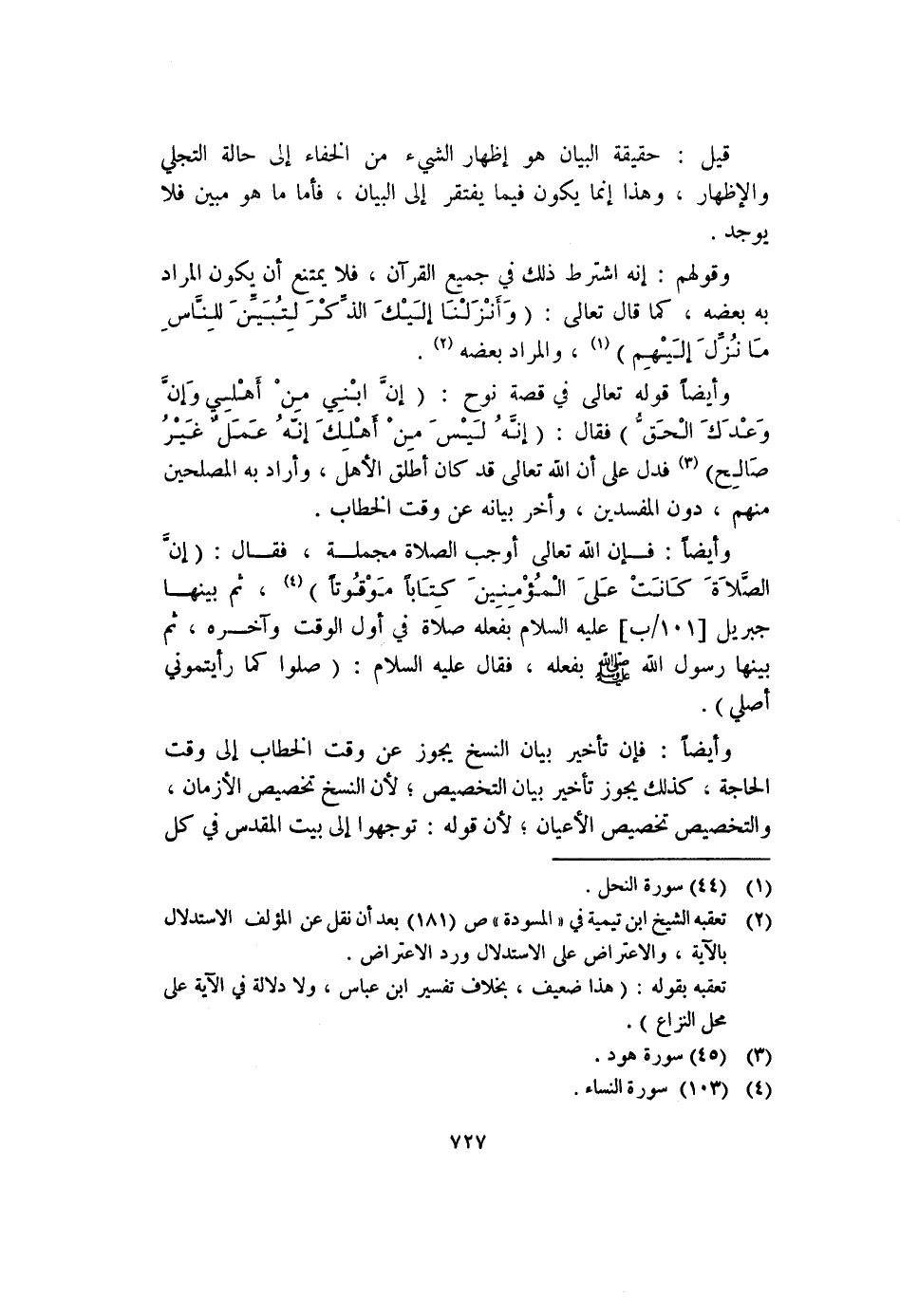 وأيضاً قوله تعالى في قصة نوح: (إنَّ ابْنِي مِنْ أَهلِي وَإن وَعْدَكَ الحق) فقال: (إنَّهُ لَيْسَ من أَهْلِكَ إنهُ عَمَلٌ غَيْرُ صَالِح) (٣) فدل على أن الله تعالى قد كان أطلق الأهل، وأراد به المصلحين منهم، دون المفسدين، وأخر بيانه عن وقت الخطاب.