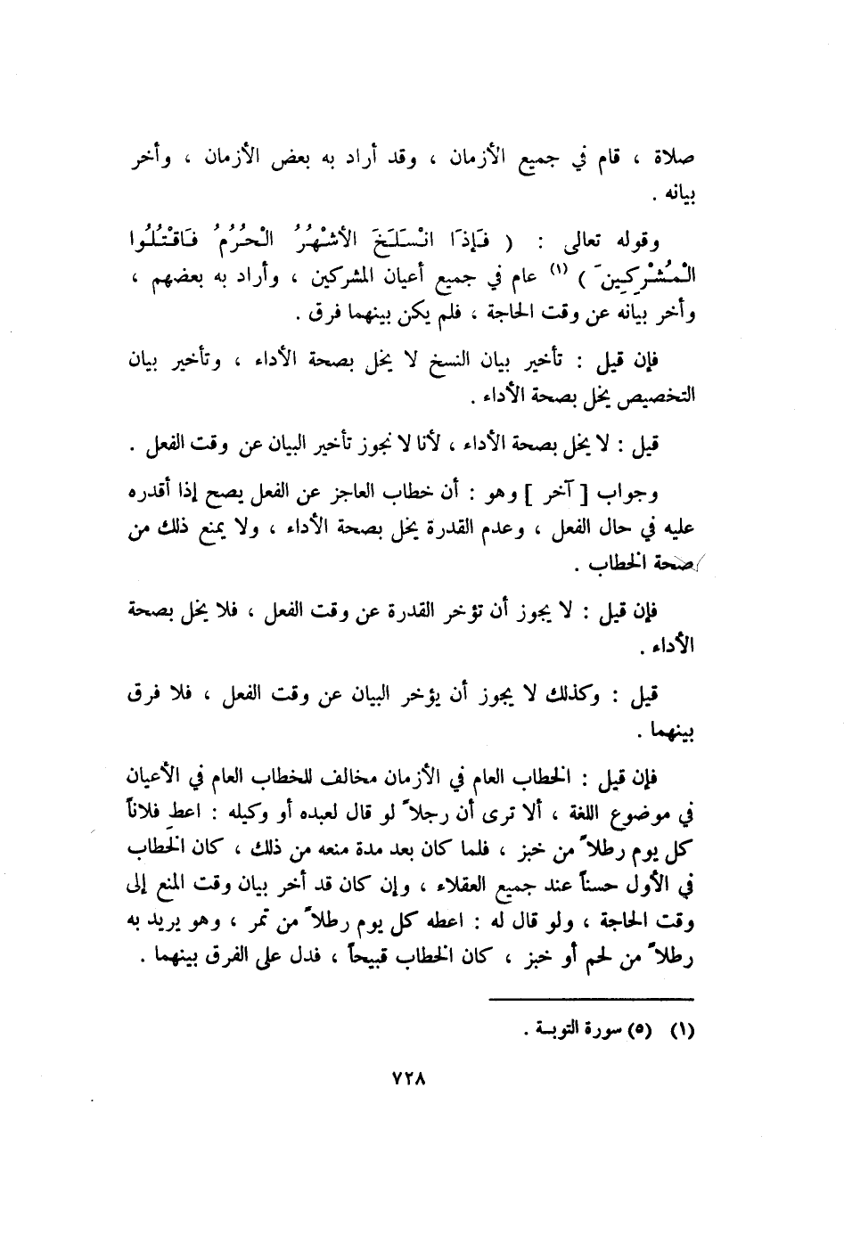 وقوله تعالى: (فإذا انسلخ الأشهر الحرم فاقتلوا المشركين) (١) عام في جميع أعيان المشركين، وأراد به بعضهم، وأخر بيانه عن وقت الحاجة فلم يكن بينهما فرق.