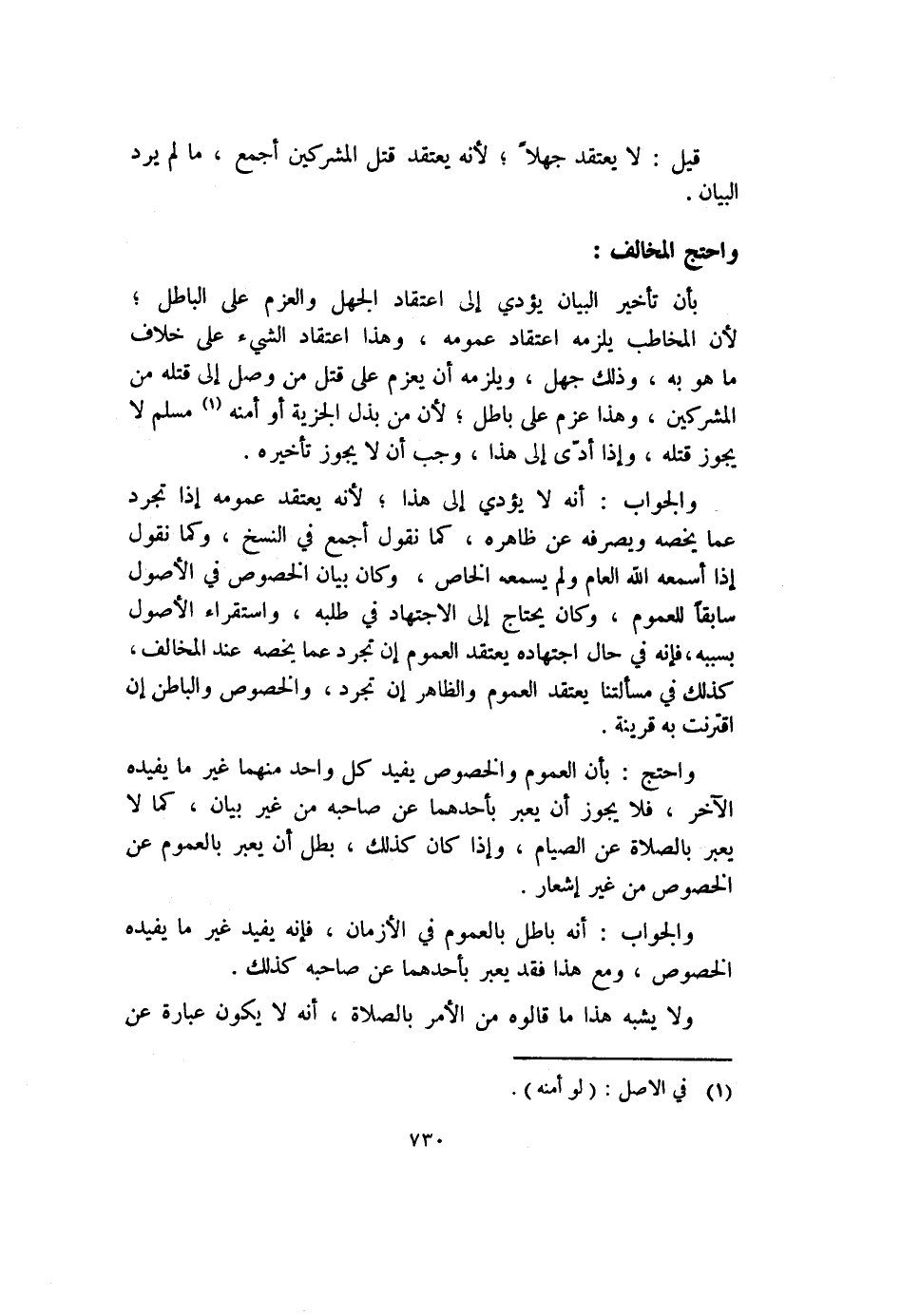 بأن تأخير البيان يؤدي إلى اعتقاد الجهل والعزم على الباطل؛ لأن المخاطب يلزمه اعتقاد عمومه، وهذا اعتقاد الشيء على خلاف ما هو به، وذلك جهل، ويلزمه أن يعزم على قتل من وصل إلى قتله من المشركين، وهذا عزم على باطل؛ لأن من بذل الجزية أو أمنه (١) مسلم لا يجوز قتله، وإذا أدّى إلى هذا، وجب أن لا يجوز تأخيره.
