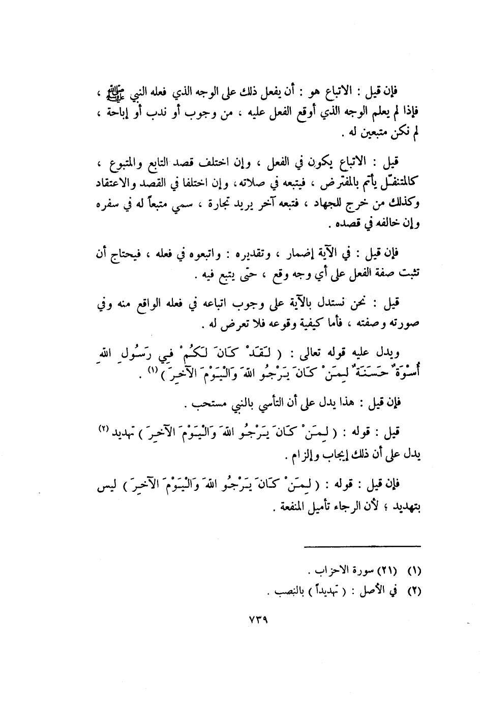 قيل: قوله: (لِمَنْ كَانَ يَرْجُو اللهَ وَالْيَوْمَ الآخِرَ) تهديد (٢) يدل على أن ذلك إيجاب وإلزام.
