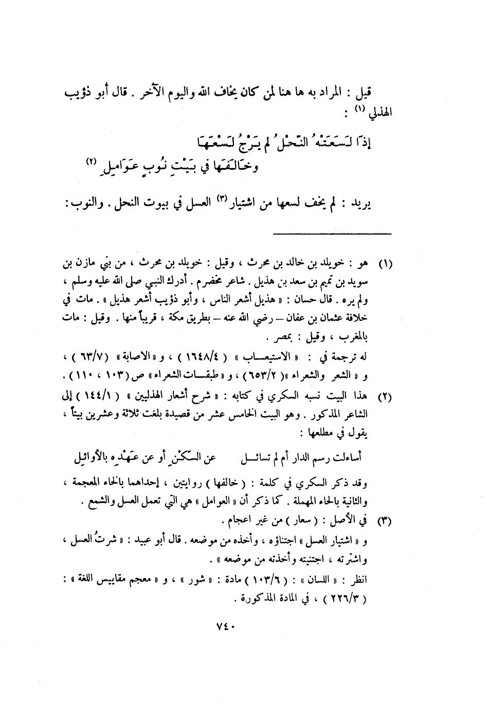 (١) هو: خويلد بن خالد بن محرث، وقيل: خويلد بن محرث، من بني مازن بن سويد بن تميم بن سعد بن هذيل. شاعر مخضرم. أدرك النبي صلى الله عليه وسلم، ولم يره. قال حسان: "هذيل أشعر الناس، وأبو ذؤيب أشعر هذيل". مات في خلافة عثمان بن عفان - رضي الله عنه - بطريق مكة، قريباً منها. وقيل: مات بالمغرب، وقيل: بمصر.