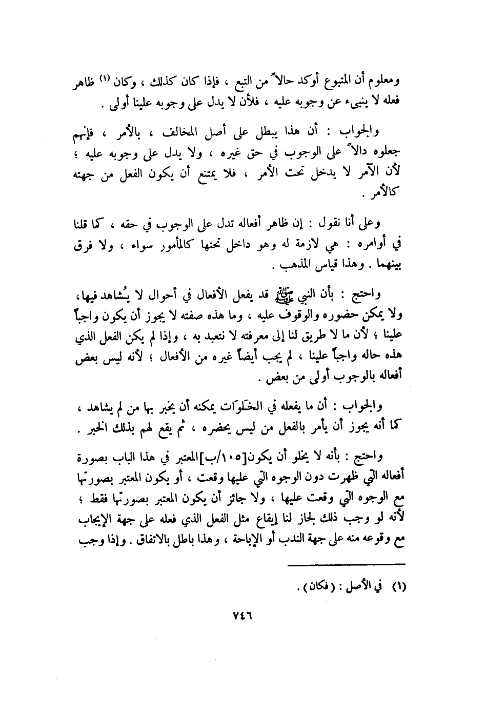 ومعلوم أن المتبوع أوكد حالاً من التبع، فإذا كان كذلك، وكان (١) ظاهر فعله لا ينبىء عن وجوبه عليه، فلأن لا يدل على وجوبه علينا أولى.