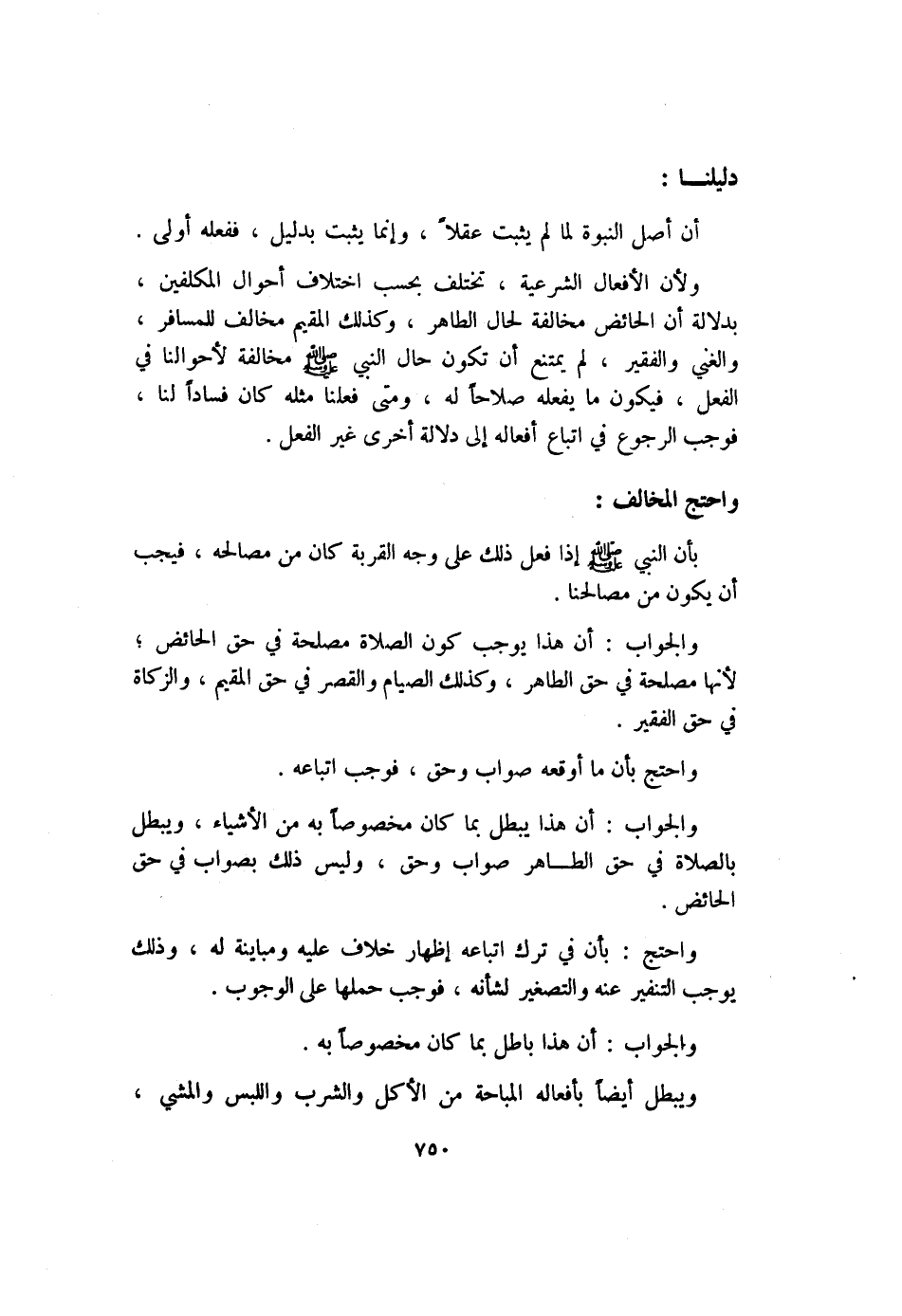 ولأن الأفعال الشرعية، تختلف بحسب اختلاف أحوال المكلفين، بدلالة أن الحائض مخالفة لحال الطاهر، وكذلك المقيم مخالف للمسافر، والغني والفقير، لم يمتنع أن تكون حال النبي - صلى الله عليه وسلم - مخالفة لأحوالنا في الفعل، فيكون ما يفعله صلاحاً له، ومتى فعلنا مثله كان فساداً لنا، فوجب الرجوع في اتباع أفعاله إلى دلالة أخرى غير الفعل.