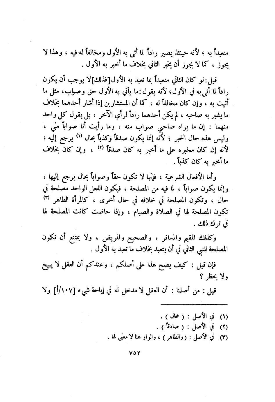 وأما الأفعال الشرعية، فإنها لا تكون حقاً وصواباً بحال يرجع إليها، وإنما يكون صوابا، لما فيه من المصلحة، فيكون الفعل الواحد مصلحة في حال، وتكون المصلحة في خلافه في حال أخرى، كالمرأة الطاهر (٣) تكون المصلحة لها في الصلاة والصيام، وإذا حاضت كانت المصلحة لها في ترك ذلك.